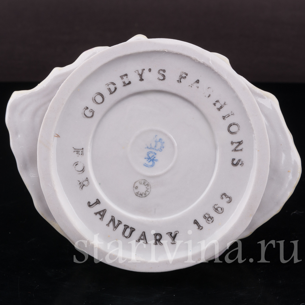 Интересная и необычная фигура дамы в модном платье создана на фабрике Sitzendorf. Статуэтка относится к серии статуэток девушек, одетых по моде журнала Godey's Lady's Book — известного американского женского журнала 19 века, ставшего во многом революционным для своего времени. Фигура обозначена как «январь 1863 года».