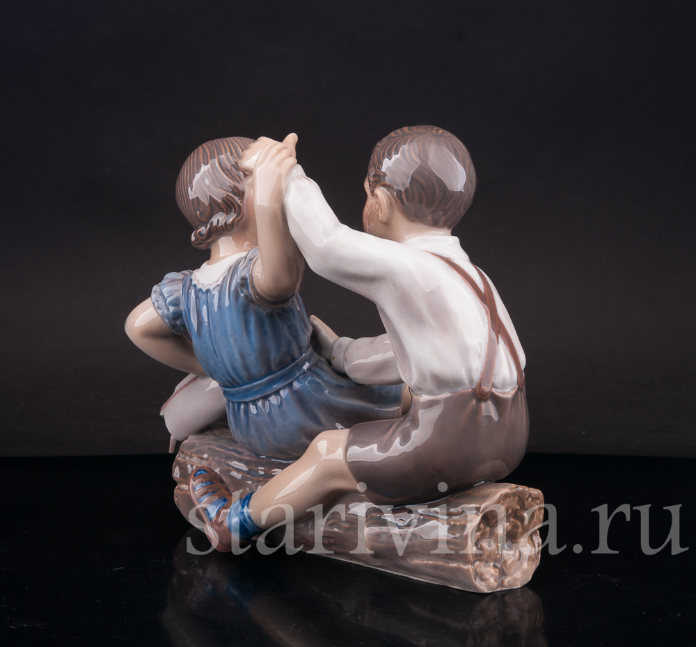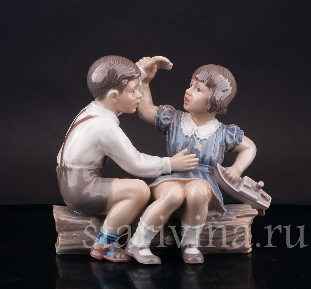 Двое детей, мальчик и девочка, ссорятся из-за кораблика, пытаясь поделить игрушку. В их движениях чувствуются эмоции, захлестнувшие малышей, которые не хотят делиться. Скульптору чудесно удалось передать настроение сцены, создав живой, реалистичный образ. Характерная для датского фарфора подглазурная роспись с преобладанием голубых и серо-коричневых оттенков подчеркивают проработку линий композиции.