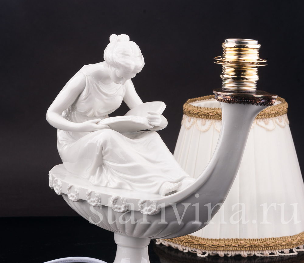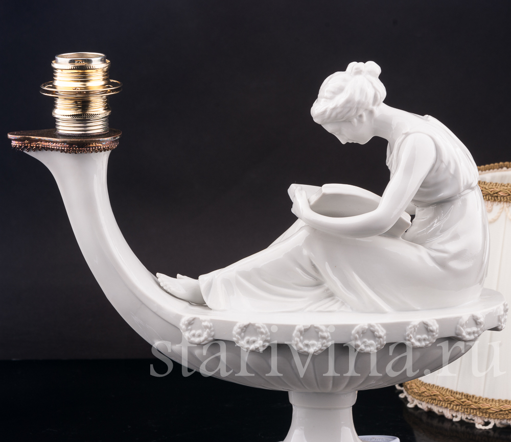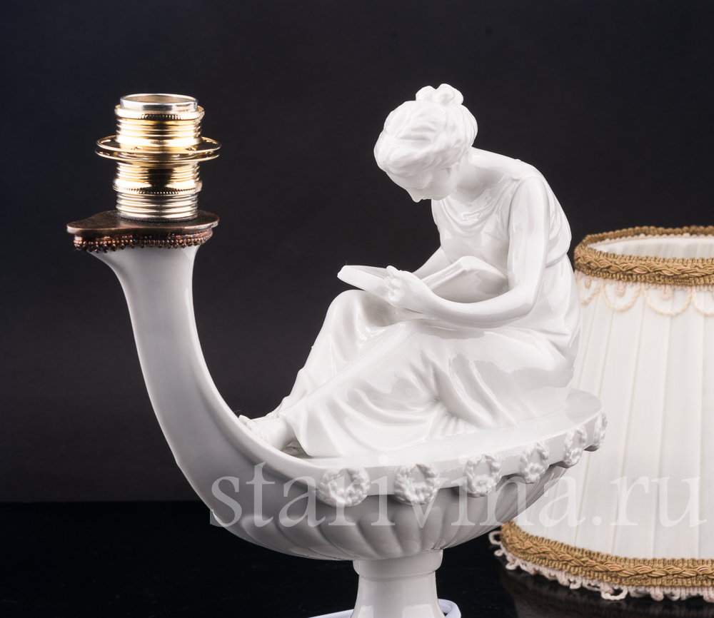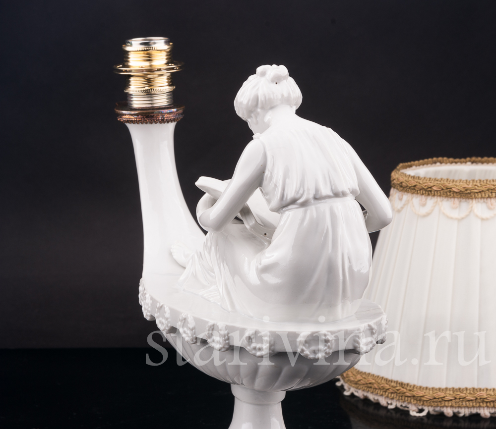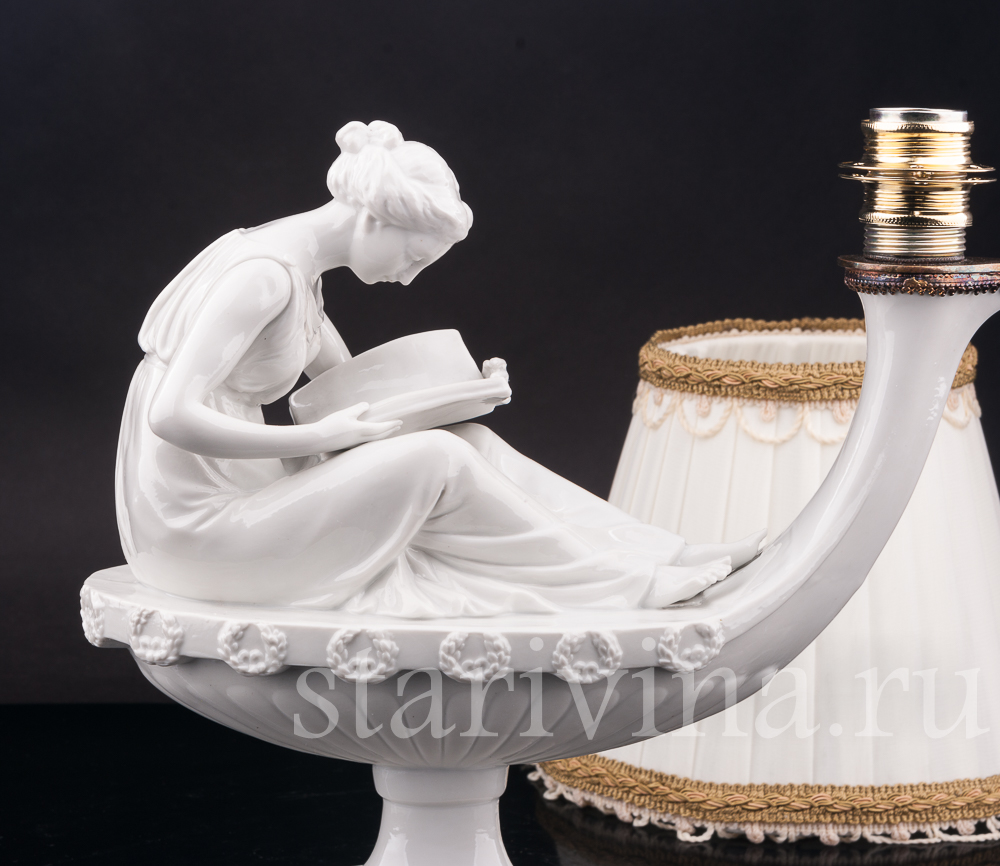 Фарфоровая лампа, украшенная романтической фигуркой читающей девушки, выполнена в форме старинного масляного светильника на одной из известнейших немецких мануфактур в городе Фолькштедт в начале прошлого столетия.