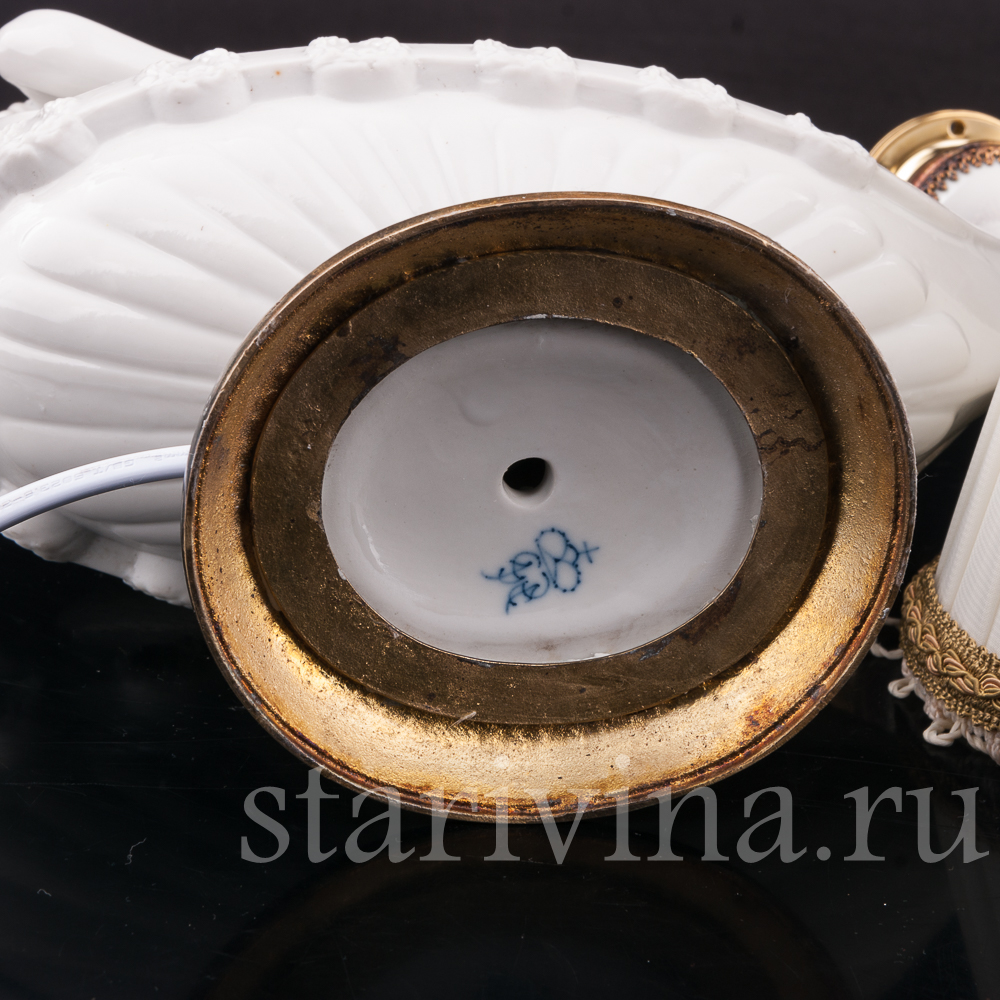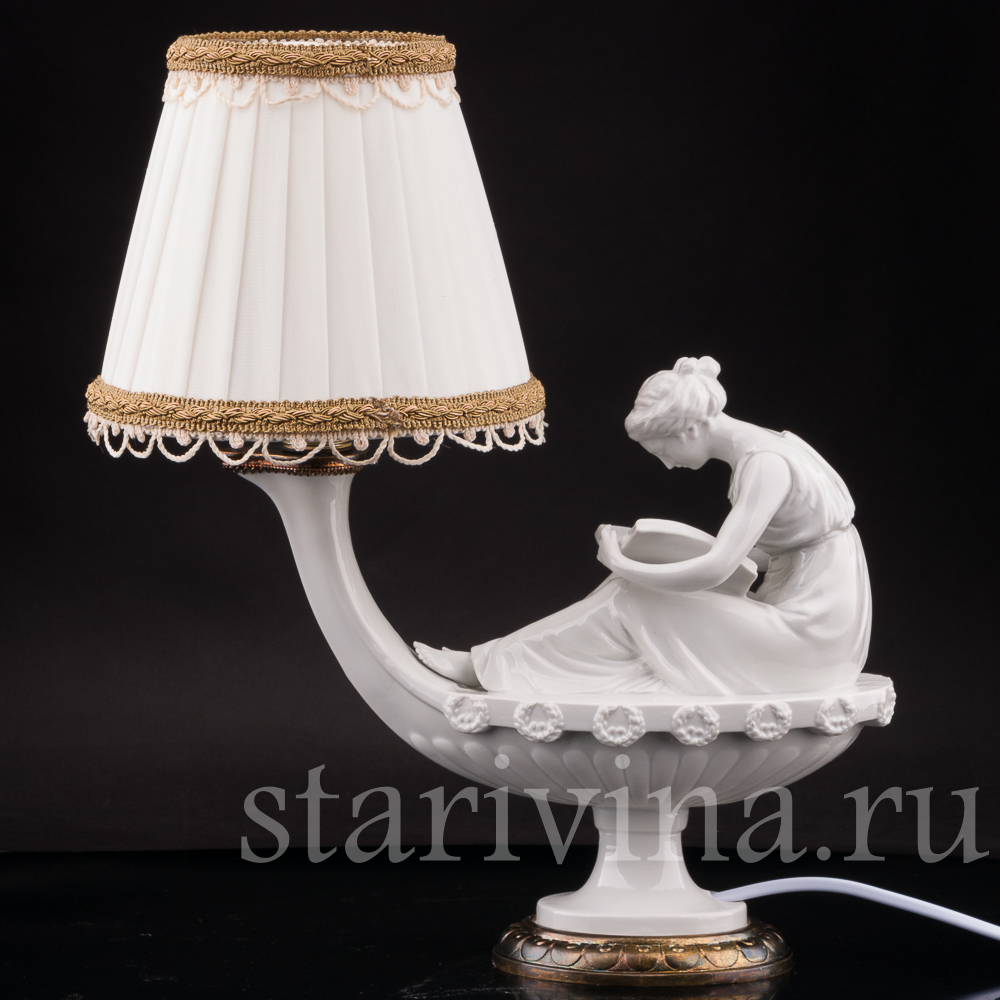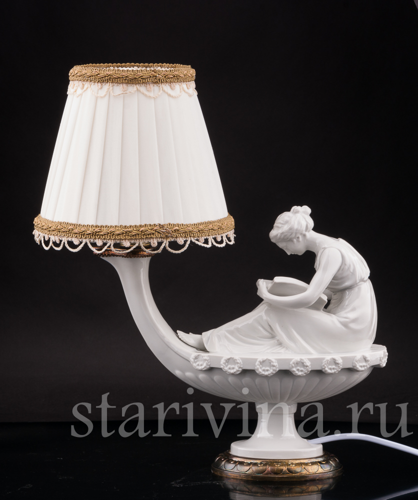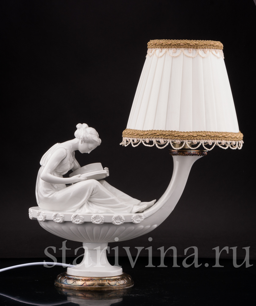 Фарфоровая лампа, украшенная романтической фигуркой читающей девушки, выполнена в форме старинного масляного светильника на одной из известнейших немецких мануфактур в городе Фолькштедт в начале прошлого столетия.