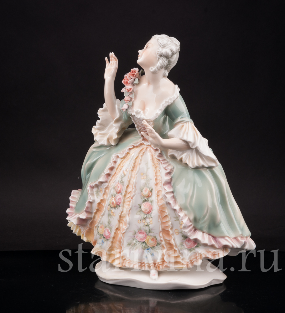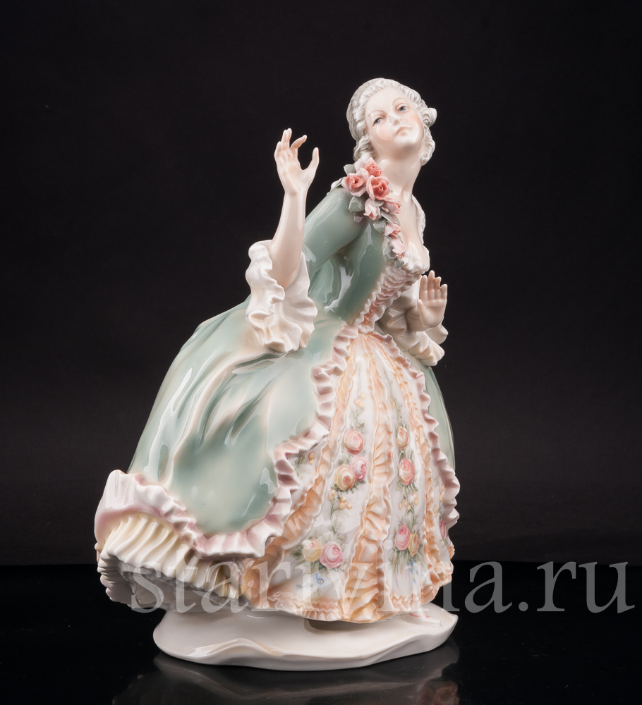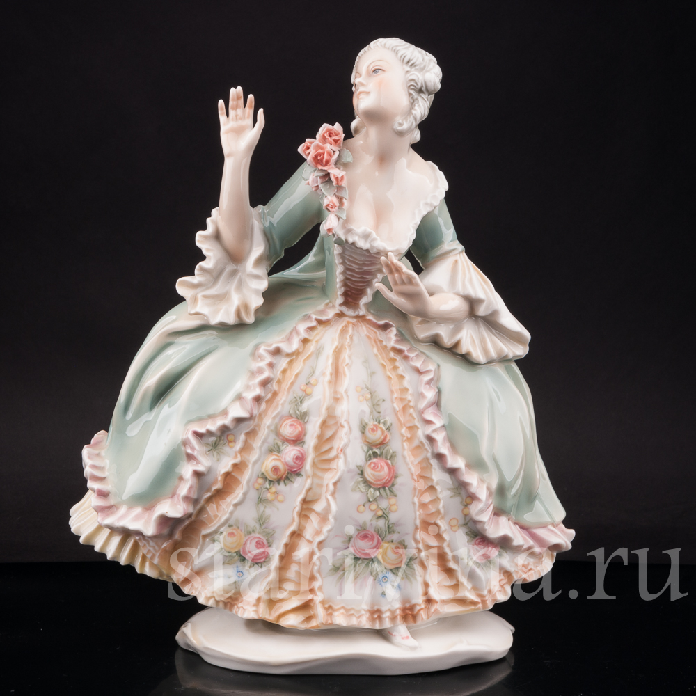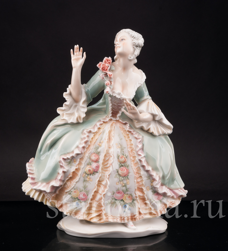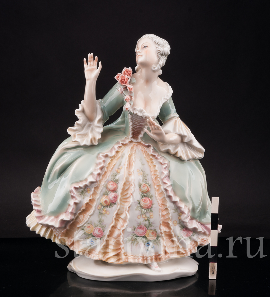 Фигура изображает красивую молодую женщину в пышном платье 18 века, прекрасную представительницу аристократии. Статуэтка расписана в узнаваемой технике фабрики Карла Энса, сочетающей полупрозрачную подглазурную роспись и нежнейшие оттенки зеленого, персикового, розового. Платье девушки украшено цветочным узором, перекликающимися с объемной композицией из роз на лифе платья. Тончайшее исполнение деталей и узоров в сочетании с нежными оттенками росписи создает хрупкий, женственный образ красавицы. Живое, реалистичное лицо и изящные жесты рук придают статуэтке эмоциональный окрас.