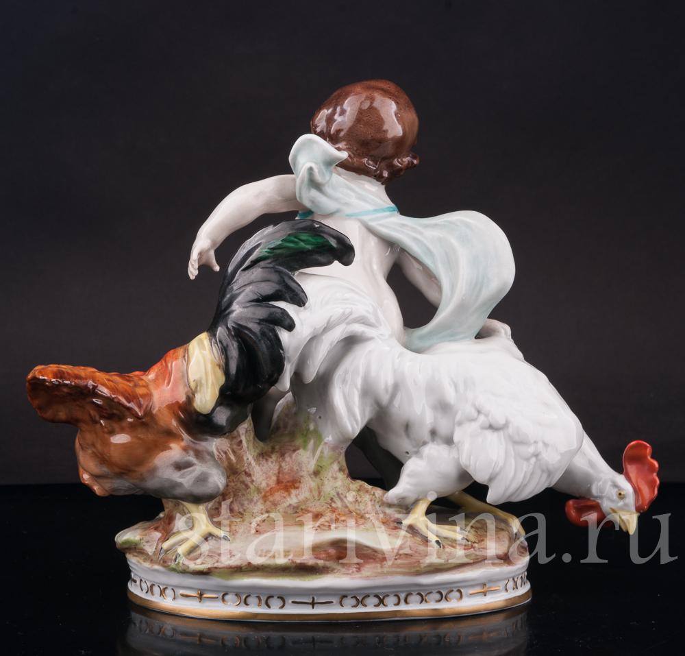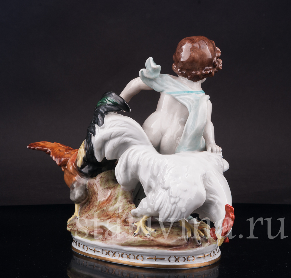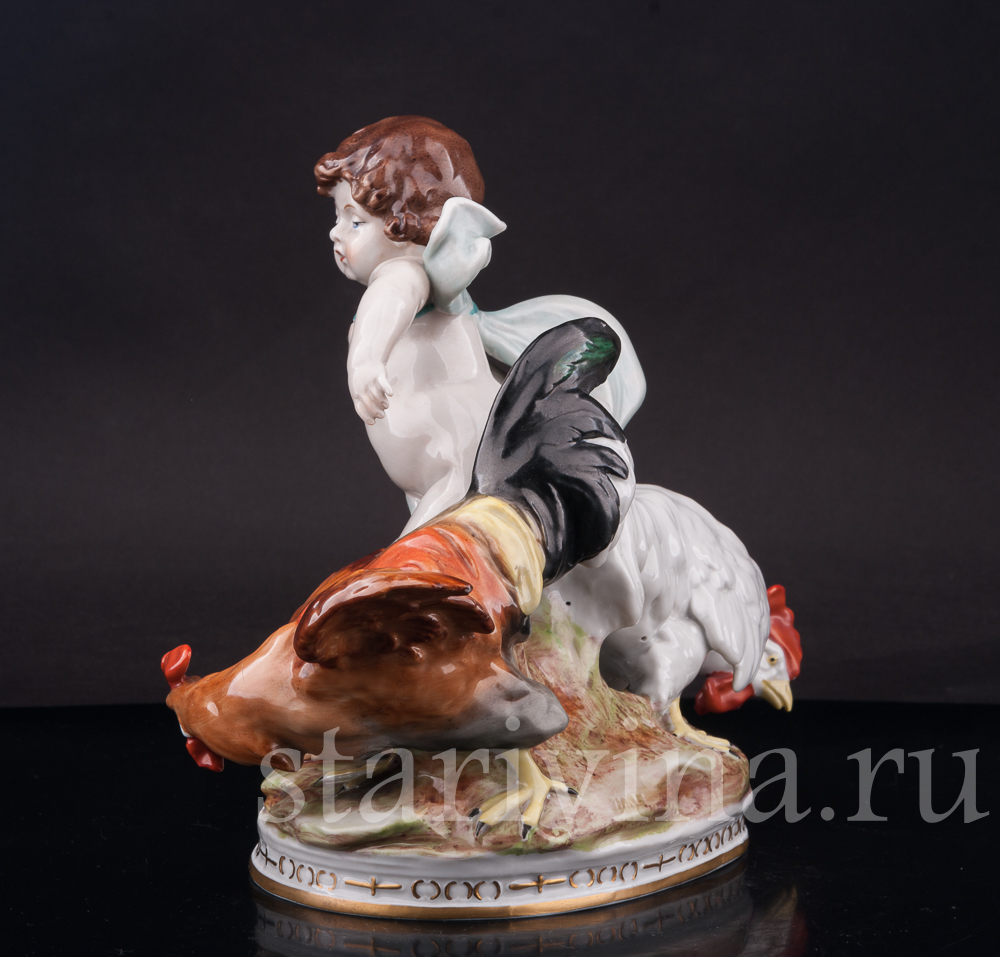Оригинальная фигурка, изображающая путти, разнимающего двух дерущихся петухов. Фигурка выполнена в лучших традициях немецкой школы художественного фарфора на одной из Тюрингских фабрик.