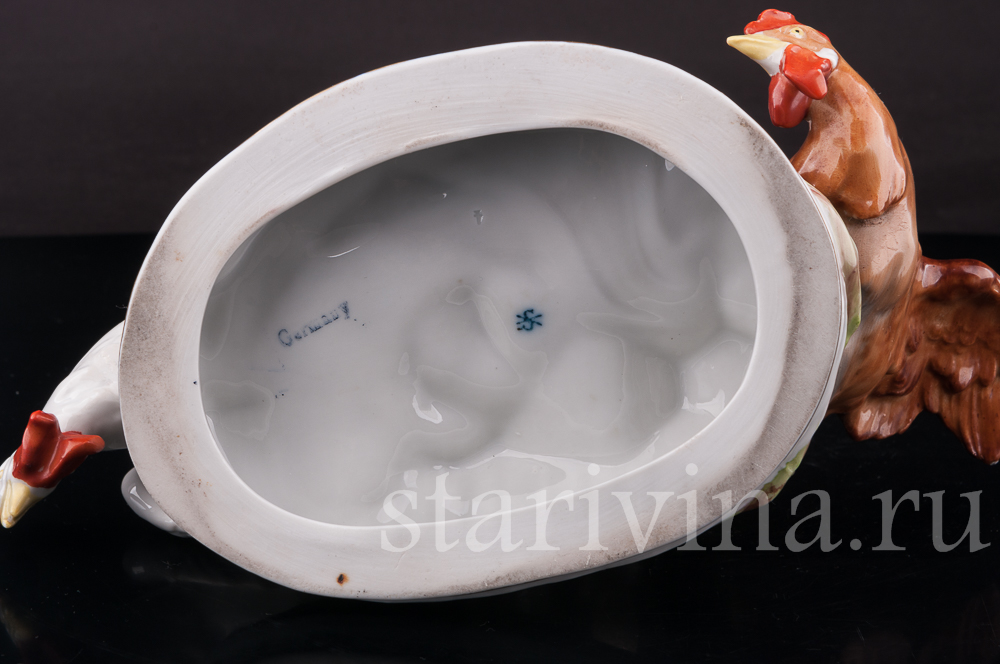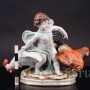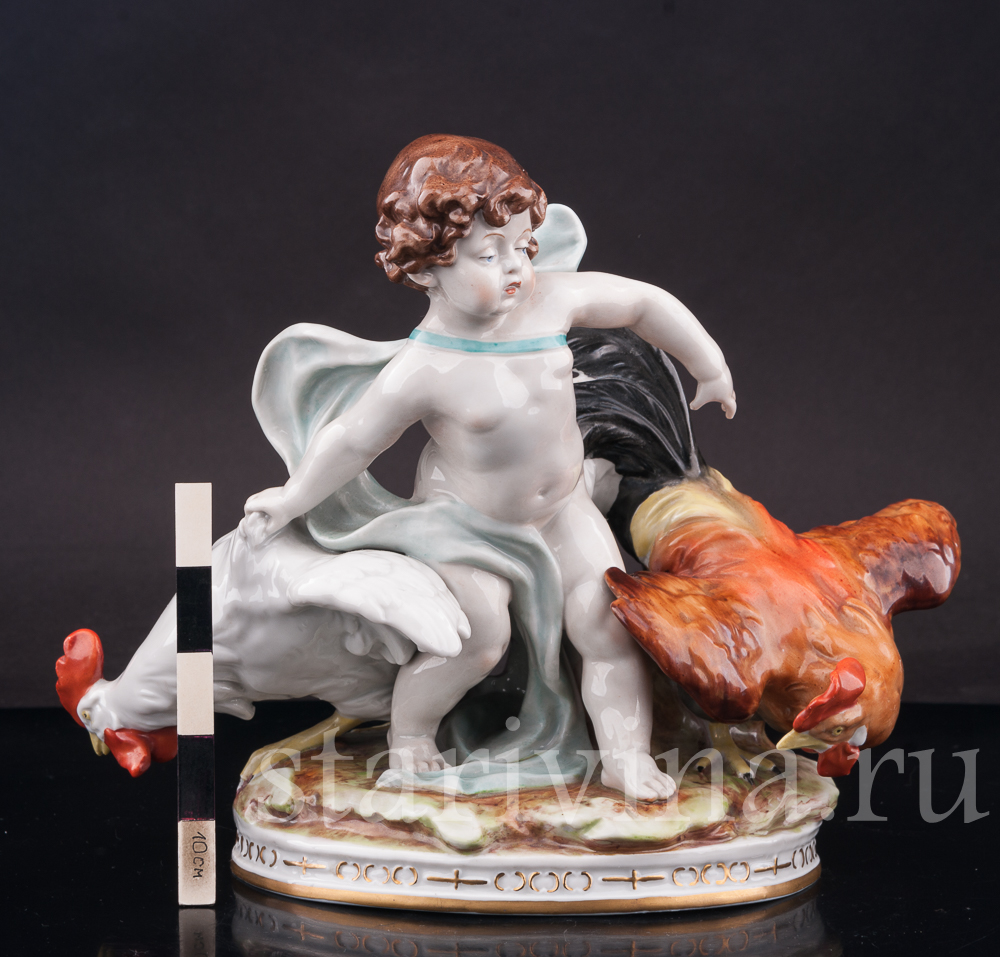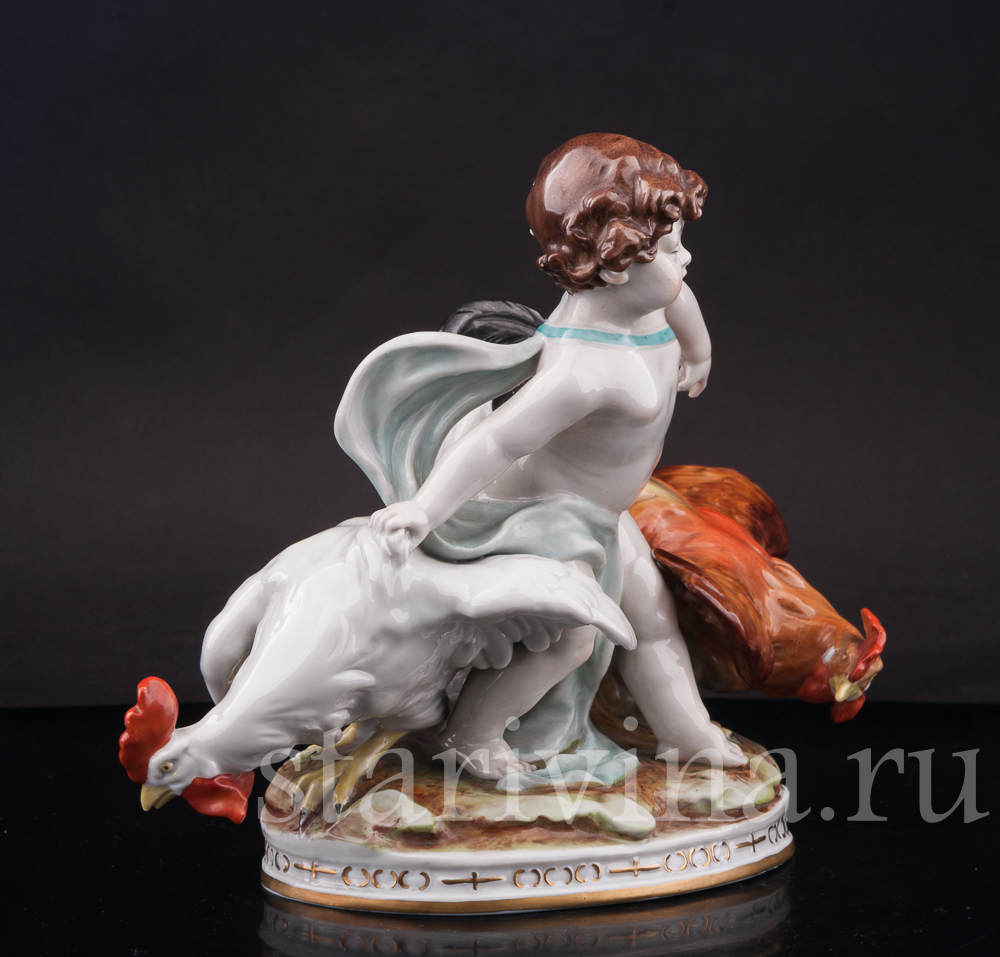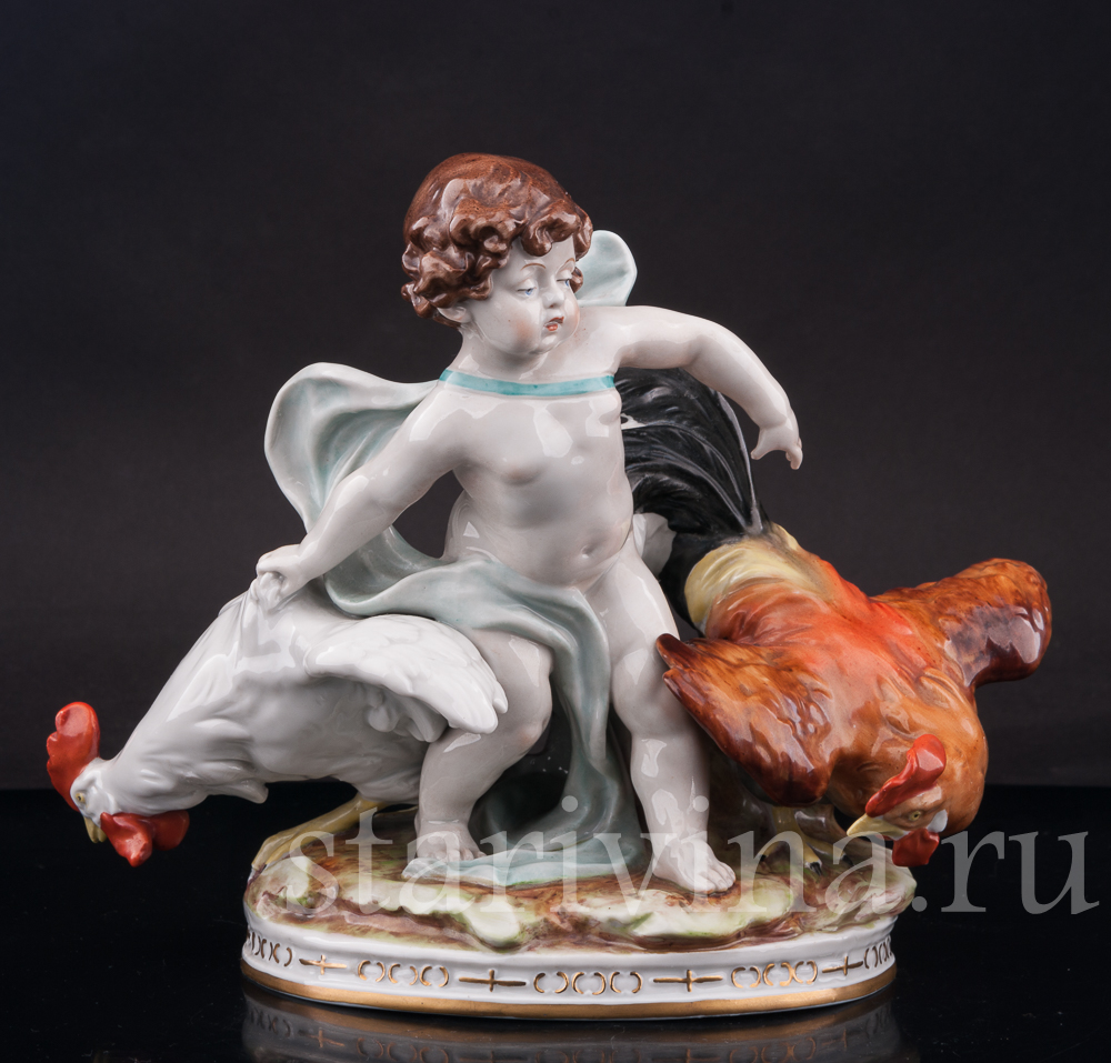 Оригинальная фигурка, изображающая путти, разнимающего двух дерущихся петухов. Фигурка выполнена в лучших традициях немецкой школы художественного фарфора на одной из Тюрингских фабрик.