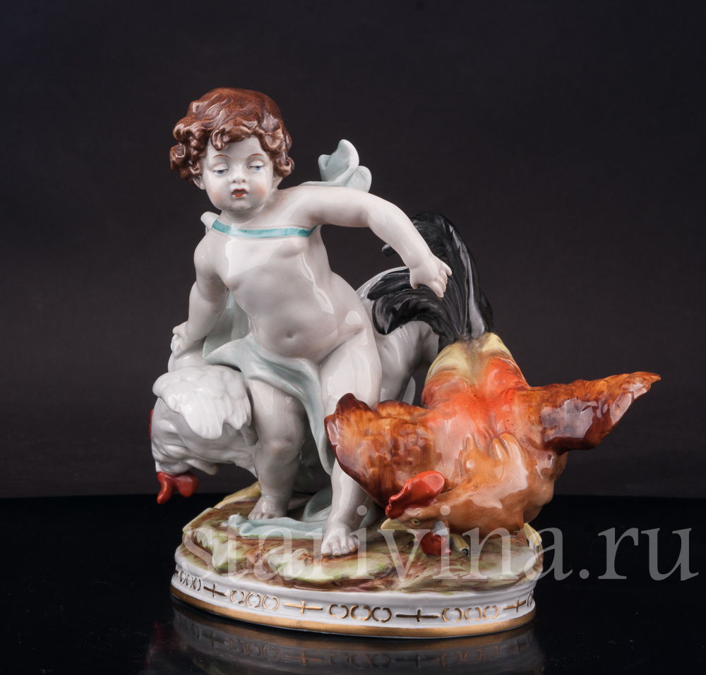 Фарфоровая статуэтка Путти, разнимающий петухов, Scheibe-Alsbach, Германия, перв. пол. 20 в.