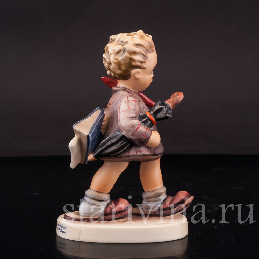 Маленький мальчик уверенно шагает по своим делам, надев папины большие тапки. Он несет зонт и книжку, будто он самый умный и деловой мальчик на свете, настоящий маленький профессор. Как и все статуэтки серии Хуммель, фигурка расписана красками теплых оттенков и обладает очарованием детской непосредственности.