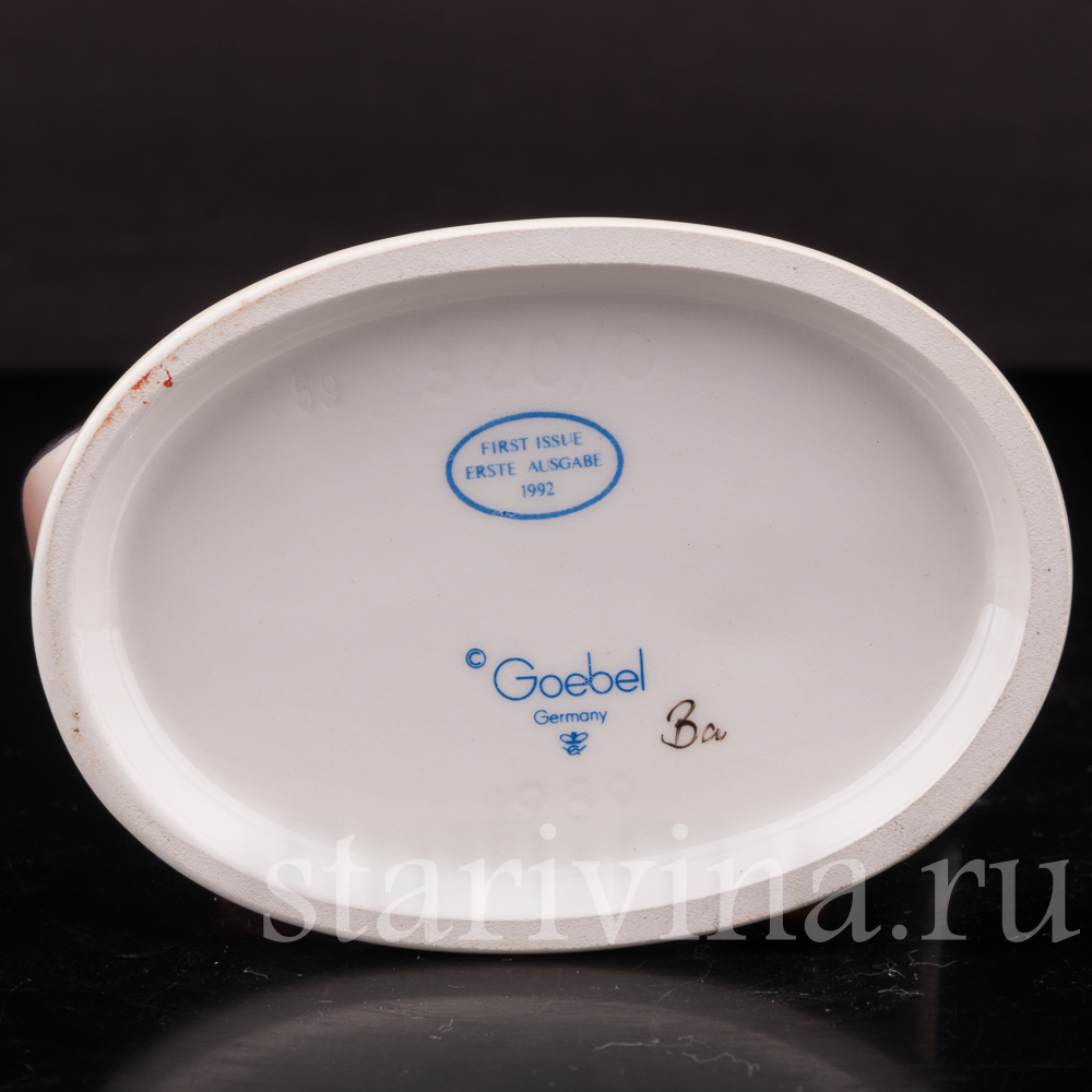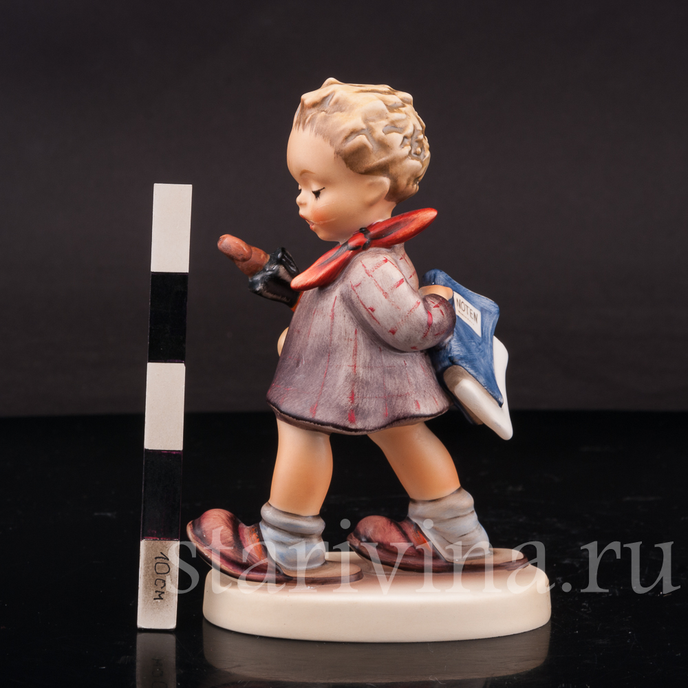 Чудесная небольшая статуэтка мальчика с зонтом и блокнотом изготовлена на фабрике Goebel и относится к серии фигур детей, создававшихся с 1935 года по эскизам монахини Марии Иннокентии Хуммель, жившей в женском монастыре в Зиссене.