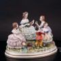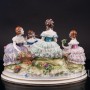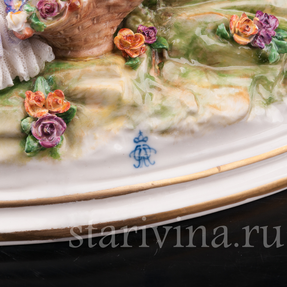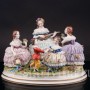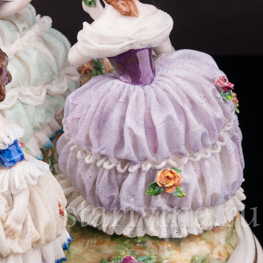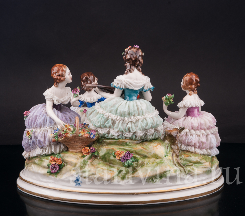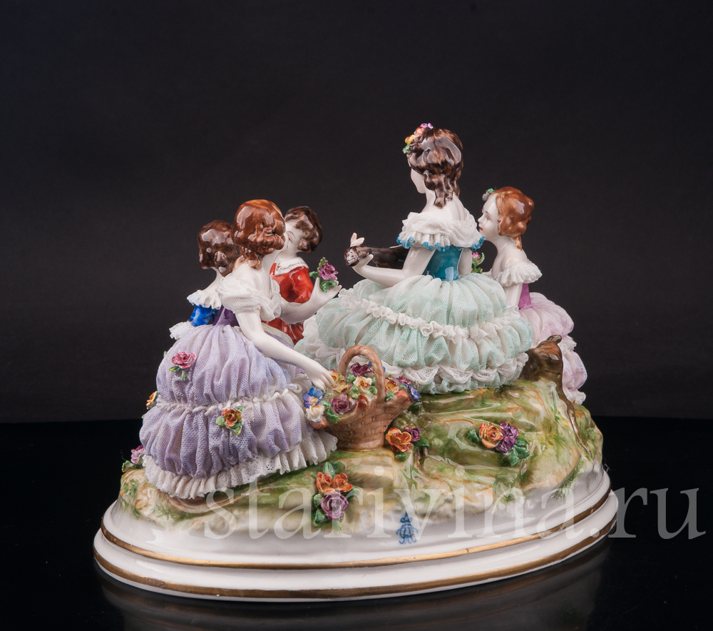 Яркая. редкая кружевная композиция с девушками и детьми, отдыхающими на лужайке, создана на фабрике Volkstedt в начале 20 века. Среди направлений работы фабрики особое место занимают фигуры, украшенные фарфоровым кружевом.