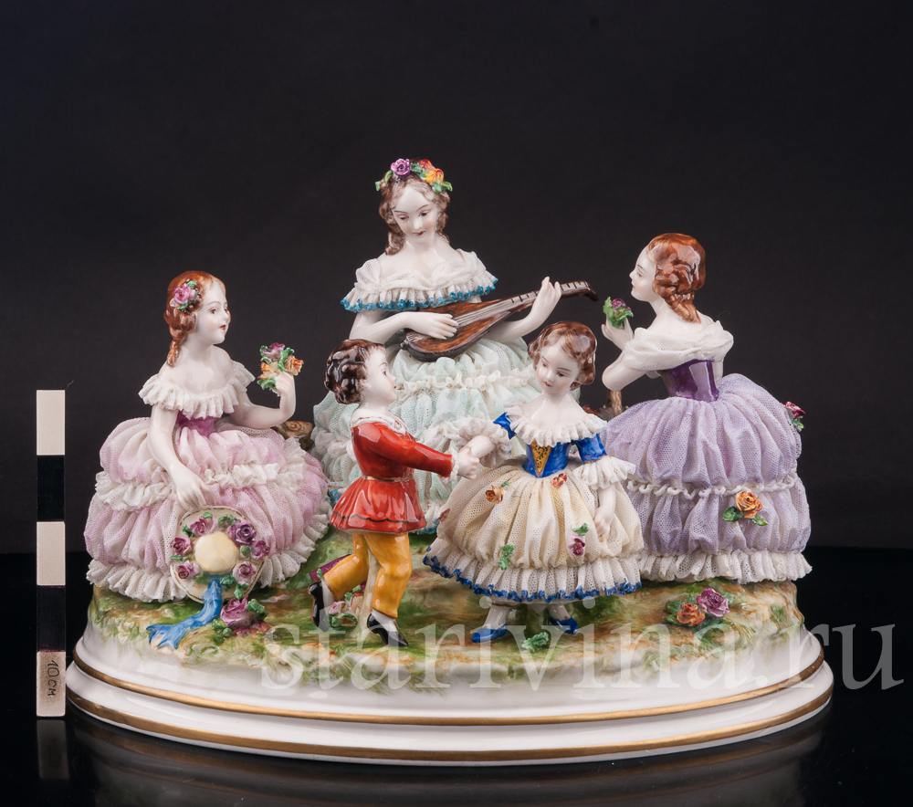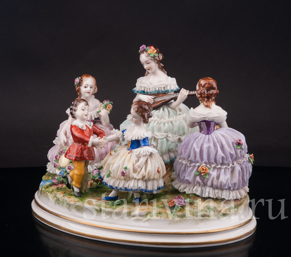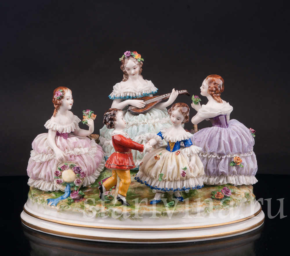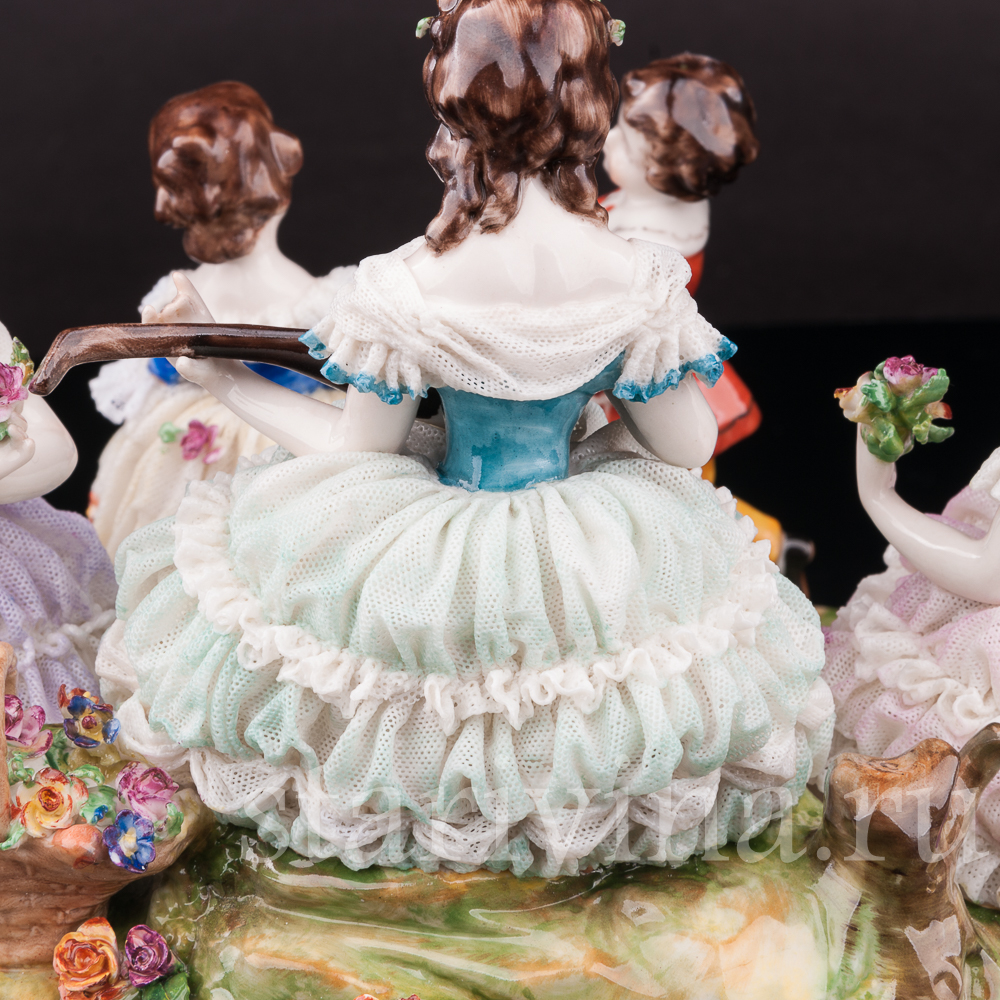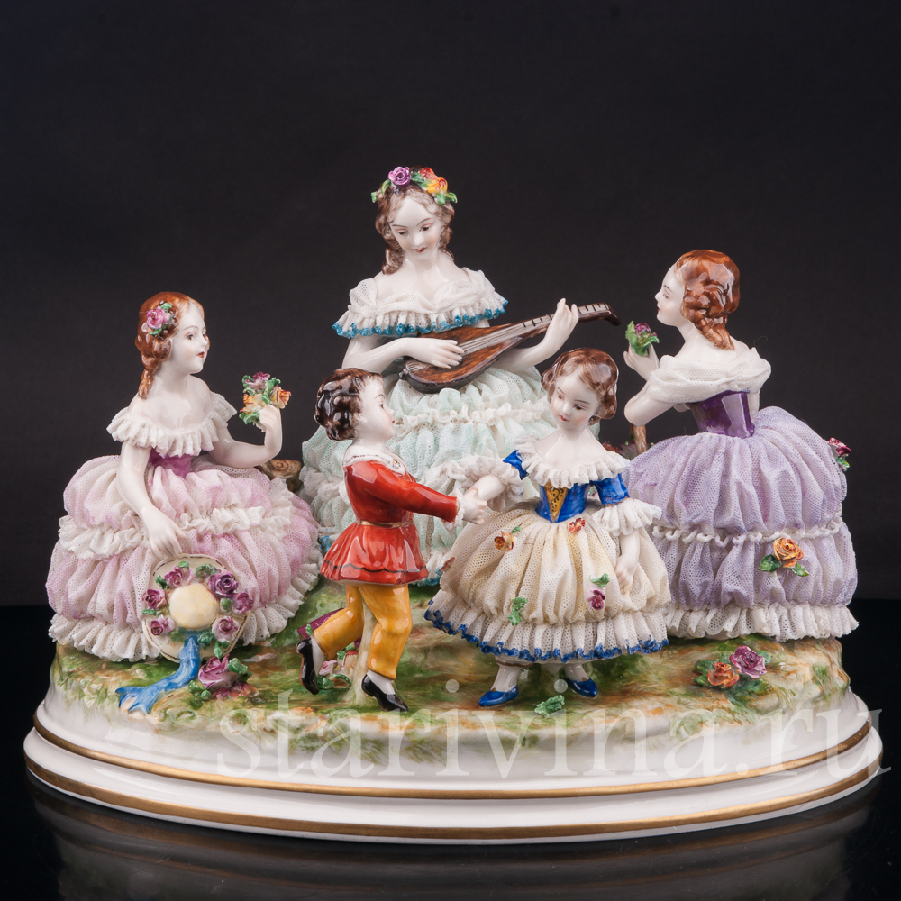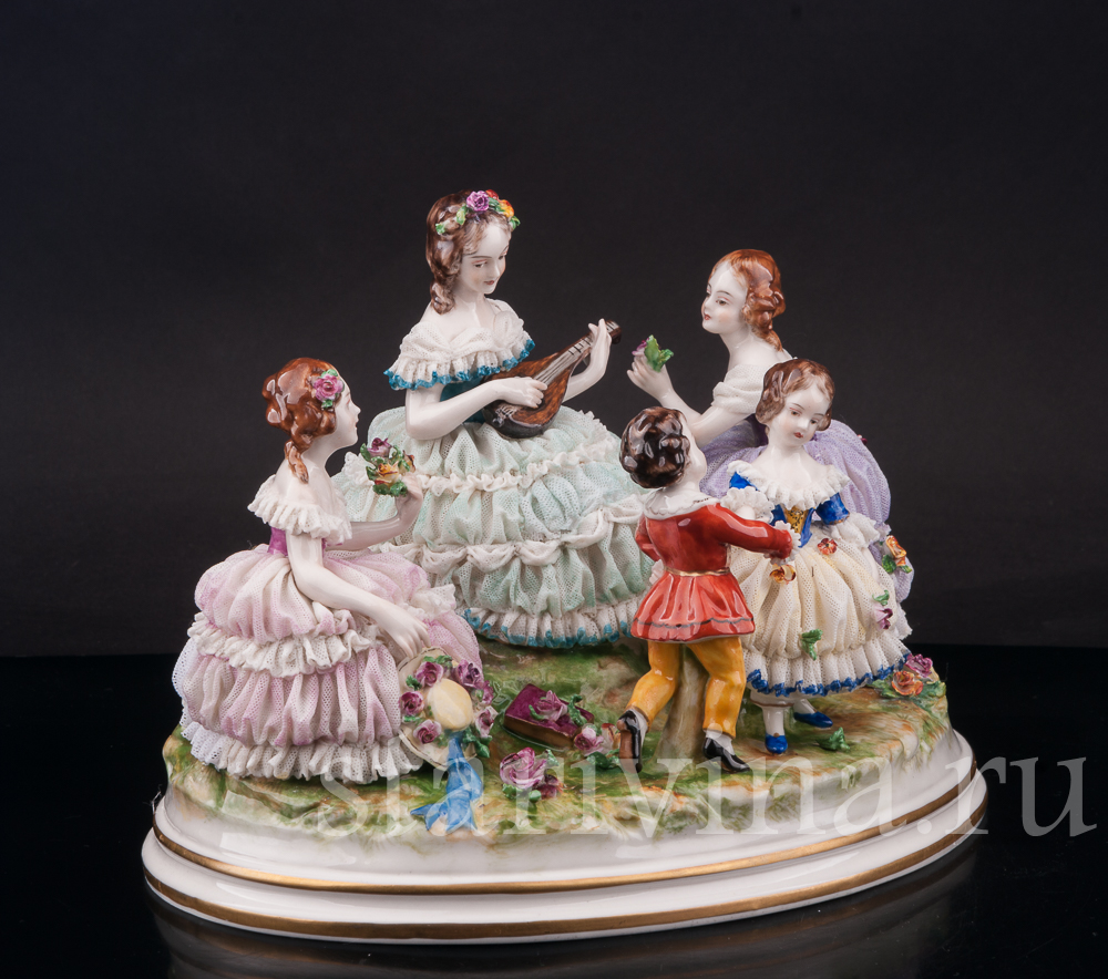 На солнечной лужайке отдыхает веселая компания. Девушки в пышных платьях наслаждаются солнечным днем, собирая цветы. Одна из девушек играет мелодию на мандолине, под которую задорно танцует пара маленьких детей. Композиция богато украшена фарфоровым кружевом разных оттенков, как классического белого, так и необычного сиреневого или бирюзового. Множество небольших цветов, украшающих статуэтку, тонко проработаны и придают композиции праздничный вид.