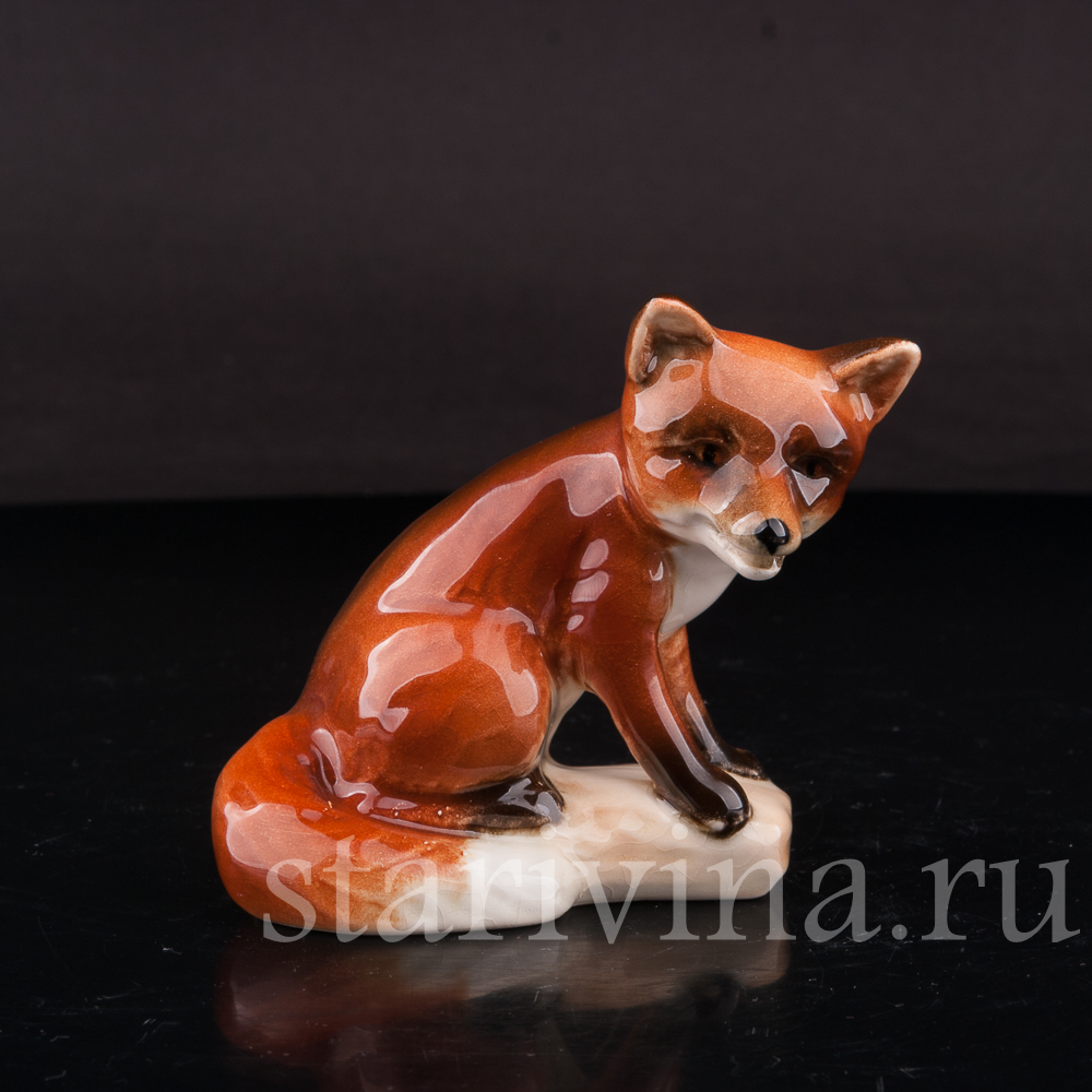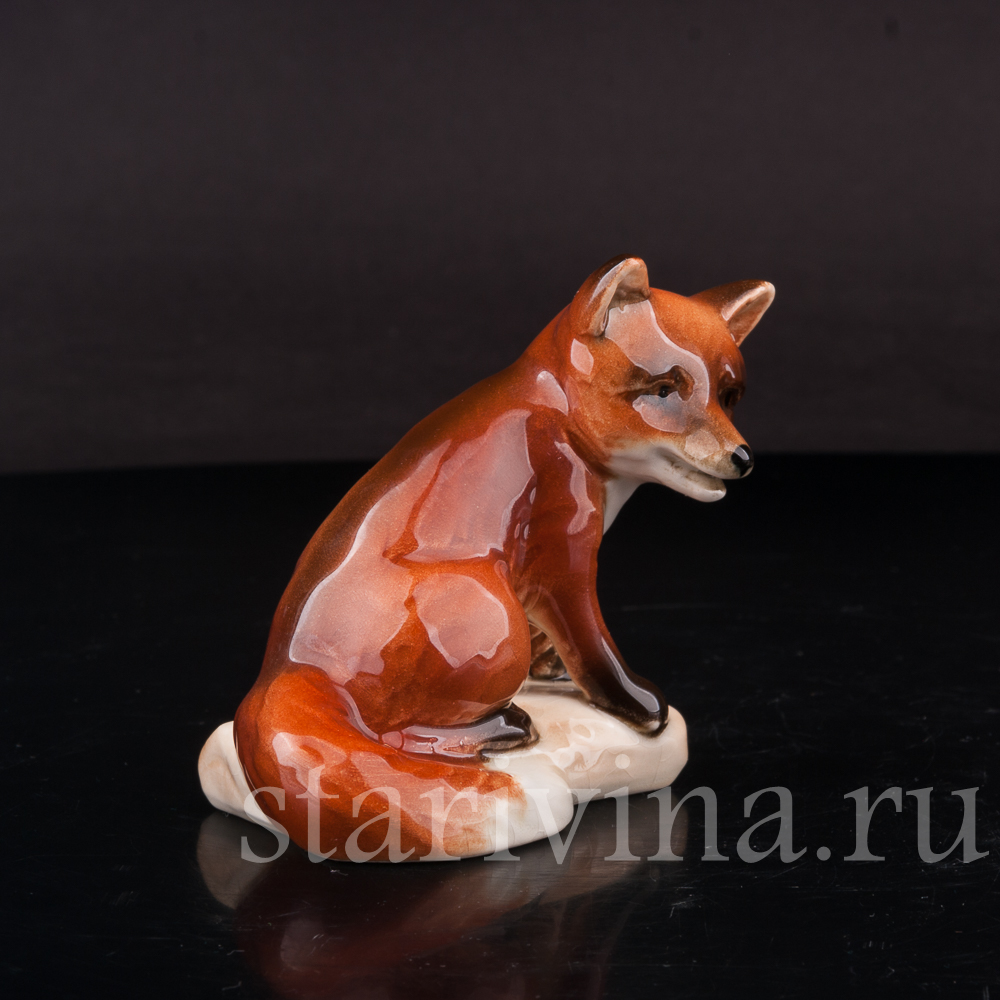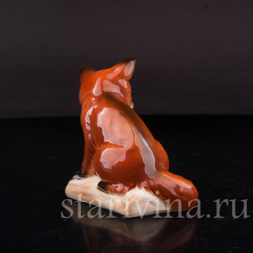 Маленькая лисичка спокойно, уютно сидит, прижав к себе пушистый хвост и смотрит куда-то в сторону внимательным взглядом темных глаз. Фигура сидящей лисы выполнена в узнаваем стиле фабрики Гебель - мягкие, объемные формы, толстый слой глазури, сглаживающий цветовые переходы насыщенной росписи и придающий статуэтке блеск, бликами играющий на свету.