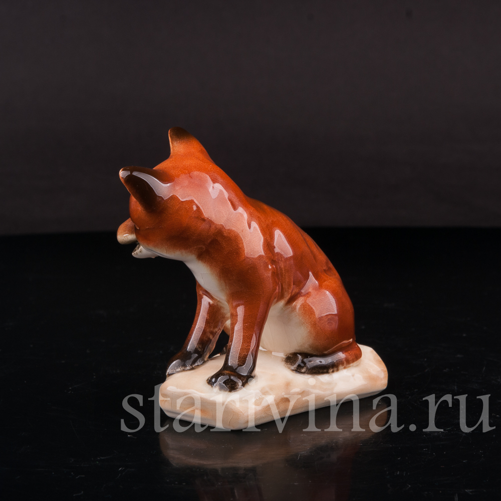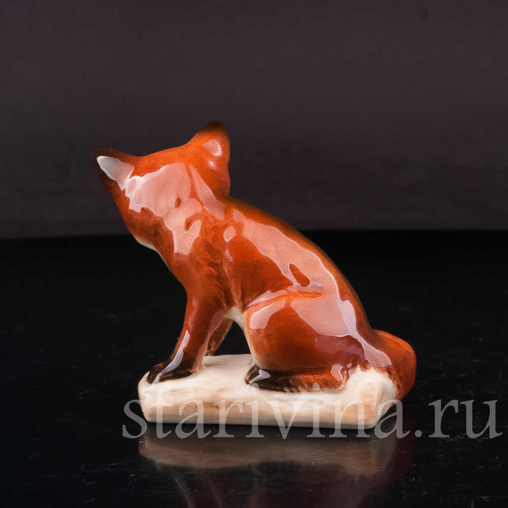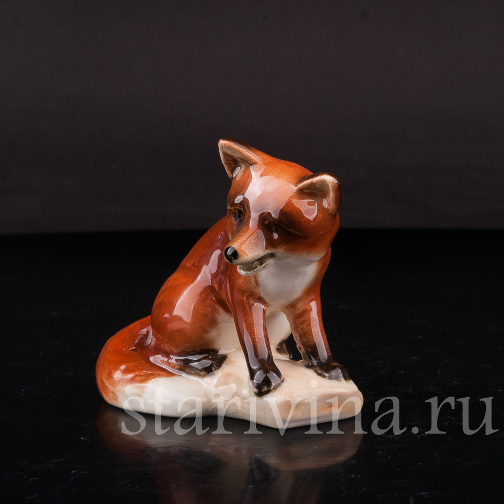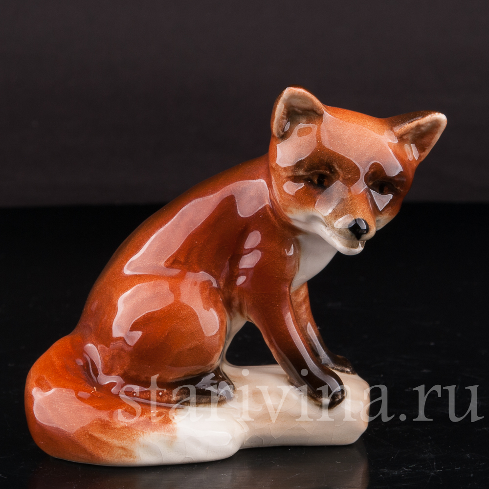 Маленькая лисичка спокойно, уютно сидит, прижав к себе пушистый хвост и смотрит куда-то в сторону внимательным взглядом темных глаз. Фигура сидящей лисы выполнена в узнаваем стиле фабрики Гебель - мягкие, объемные формы, толстый слой глазури, сглаживающий цветовые переходы насыщенной росписи и придающий статуэтке блеск, бликами играющий на свету.