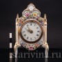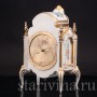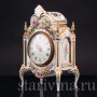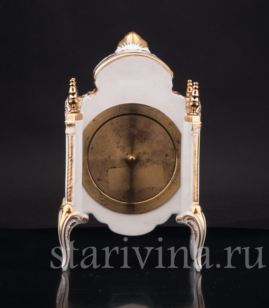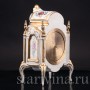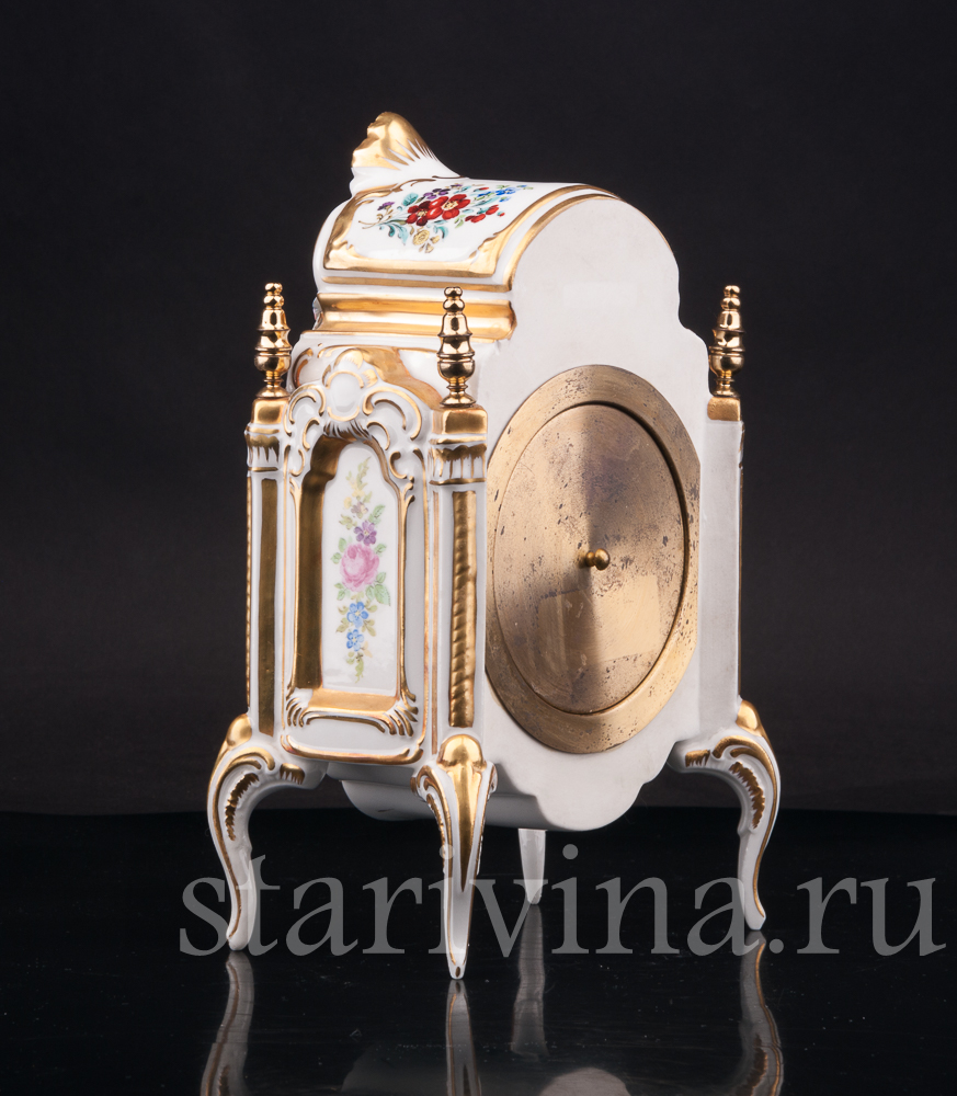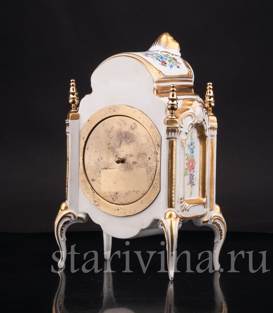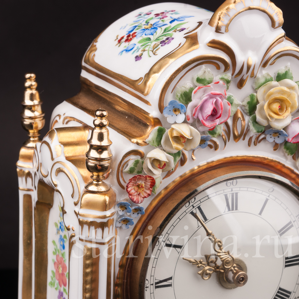 Изысканные рокальные формы, тончайшая искусная роспись золотом и цветочными орнаментами, множество цветов ручной лепки украшают бело-золотой корпус, углы которого увенчаны металлическими шпилями.