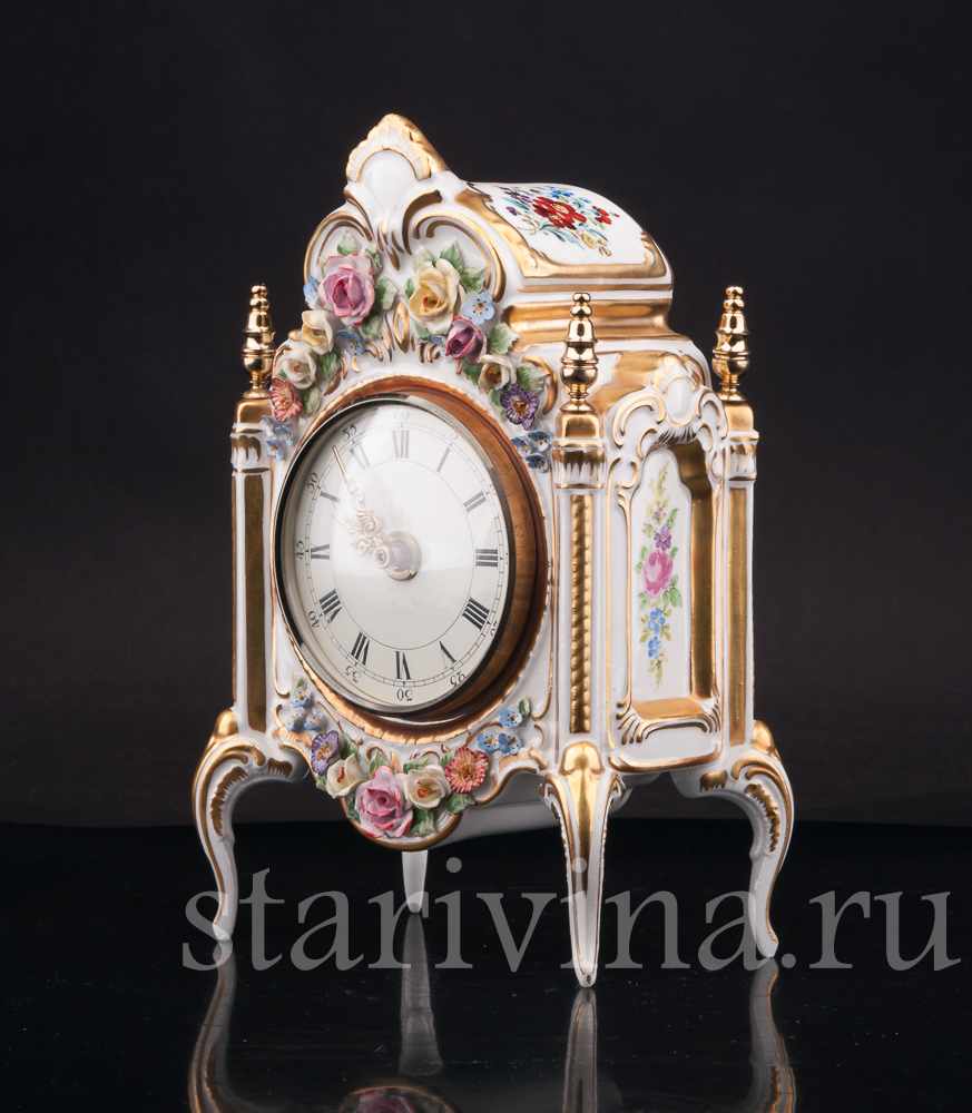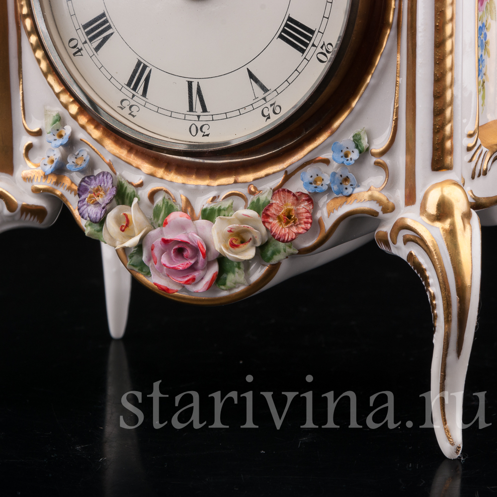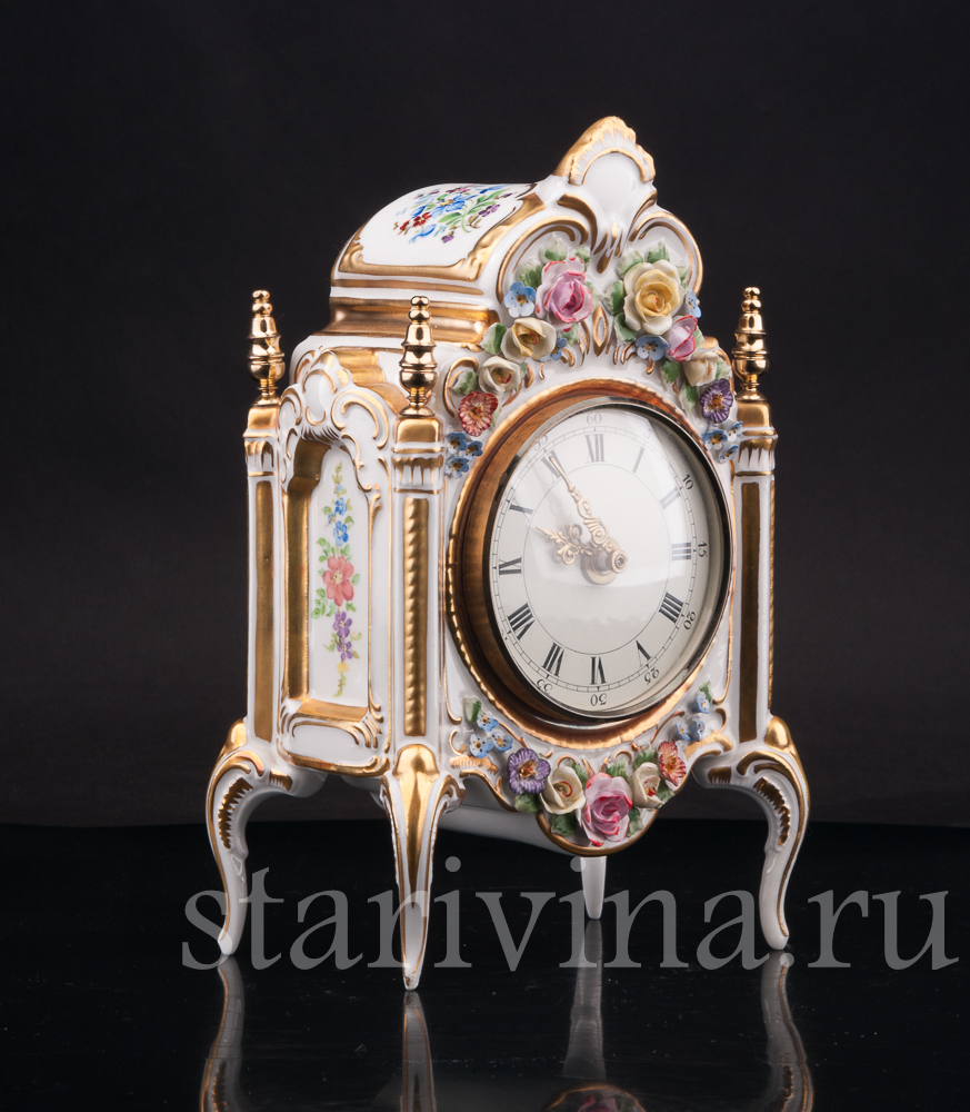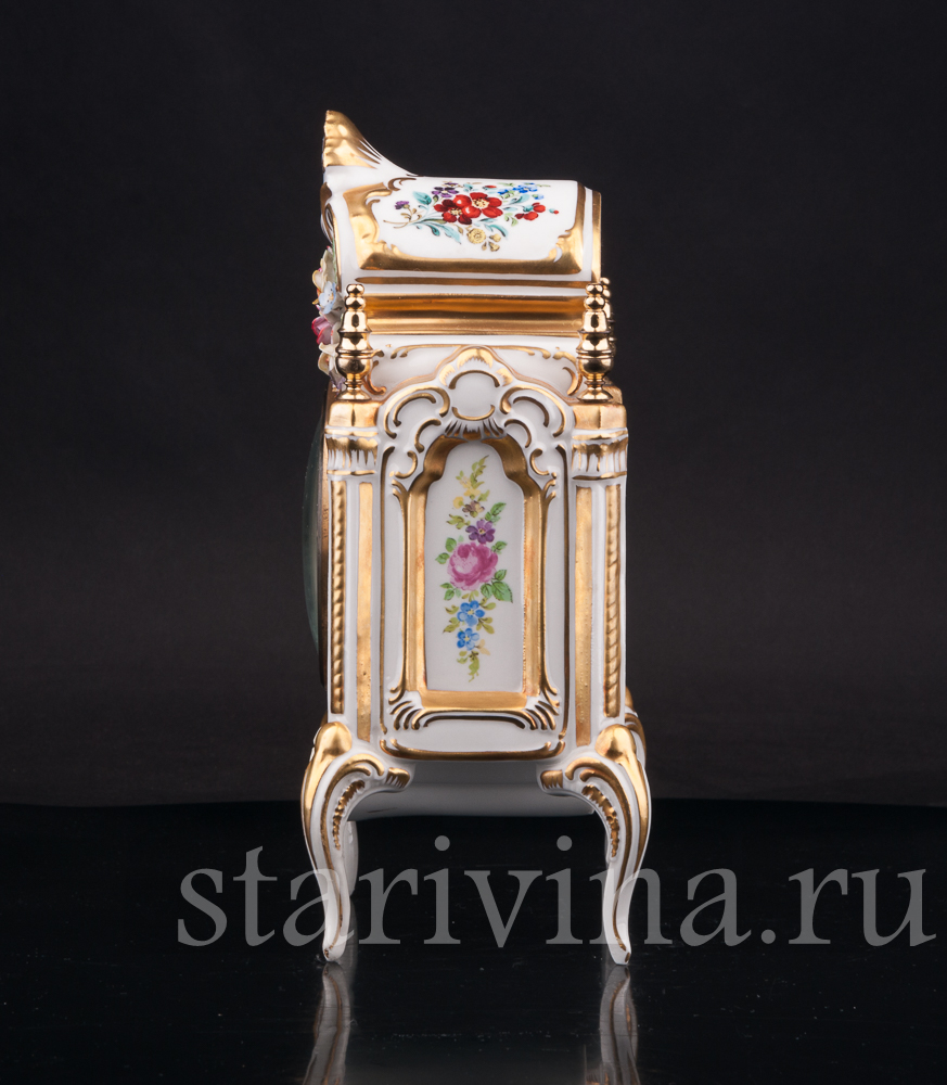 Изящные фарфоровые часы, украшенные цветочными букетами и гирляндами, изготовлены во второй половине 20 века и представляют собой великолепный образчик дрезденского фарфора.