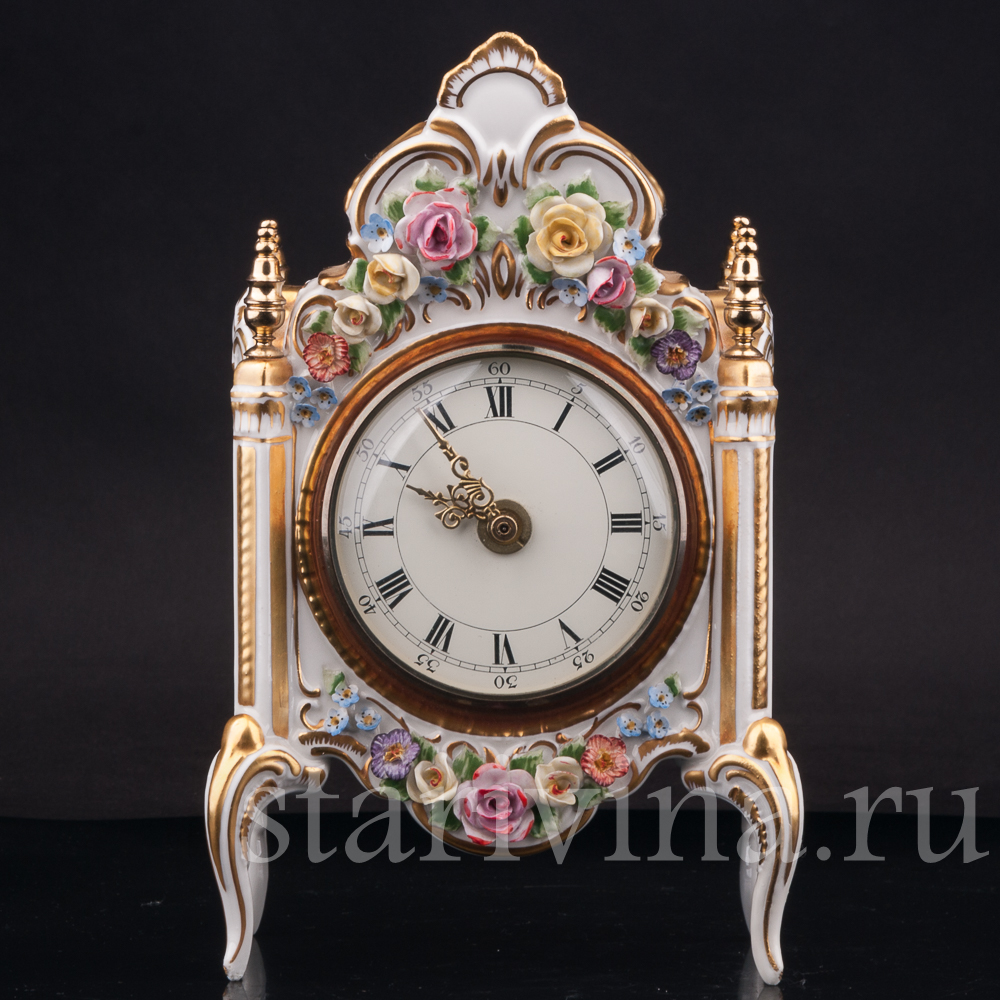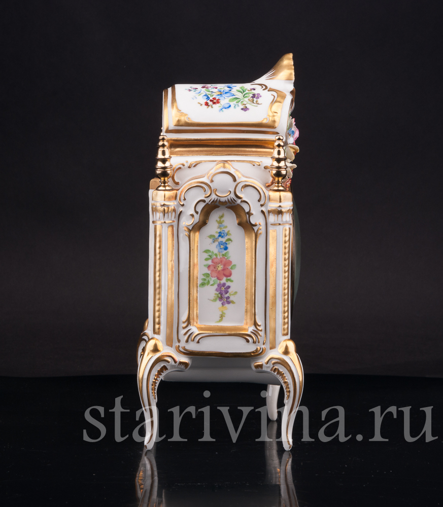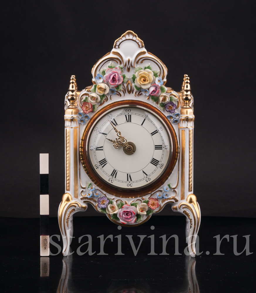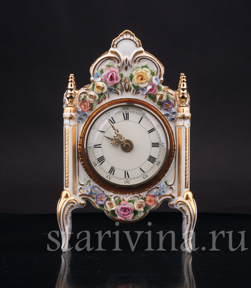 Изящные фарфоровые часы, украшенные цветочными букетами и гирляндами, изготовлены во второй половине 20 века и представляют собой великолепный образчик дрезденского фарфора.