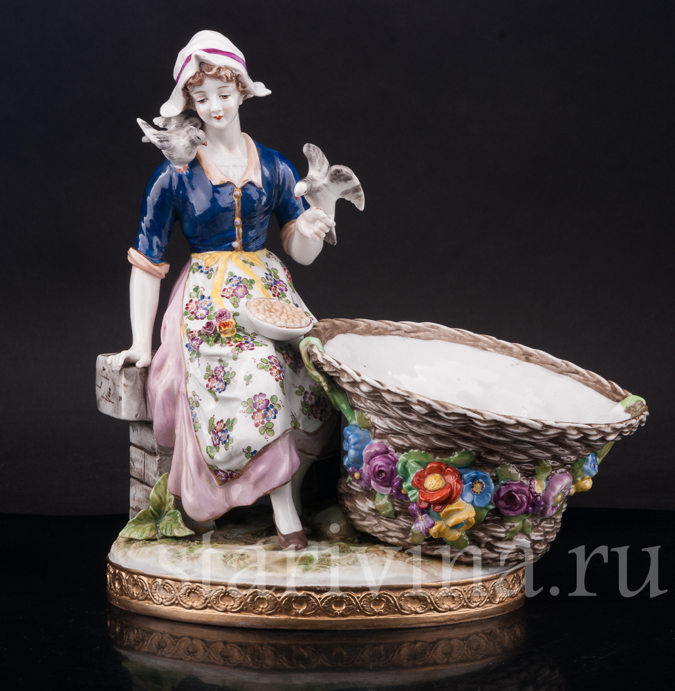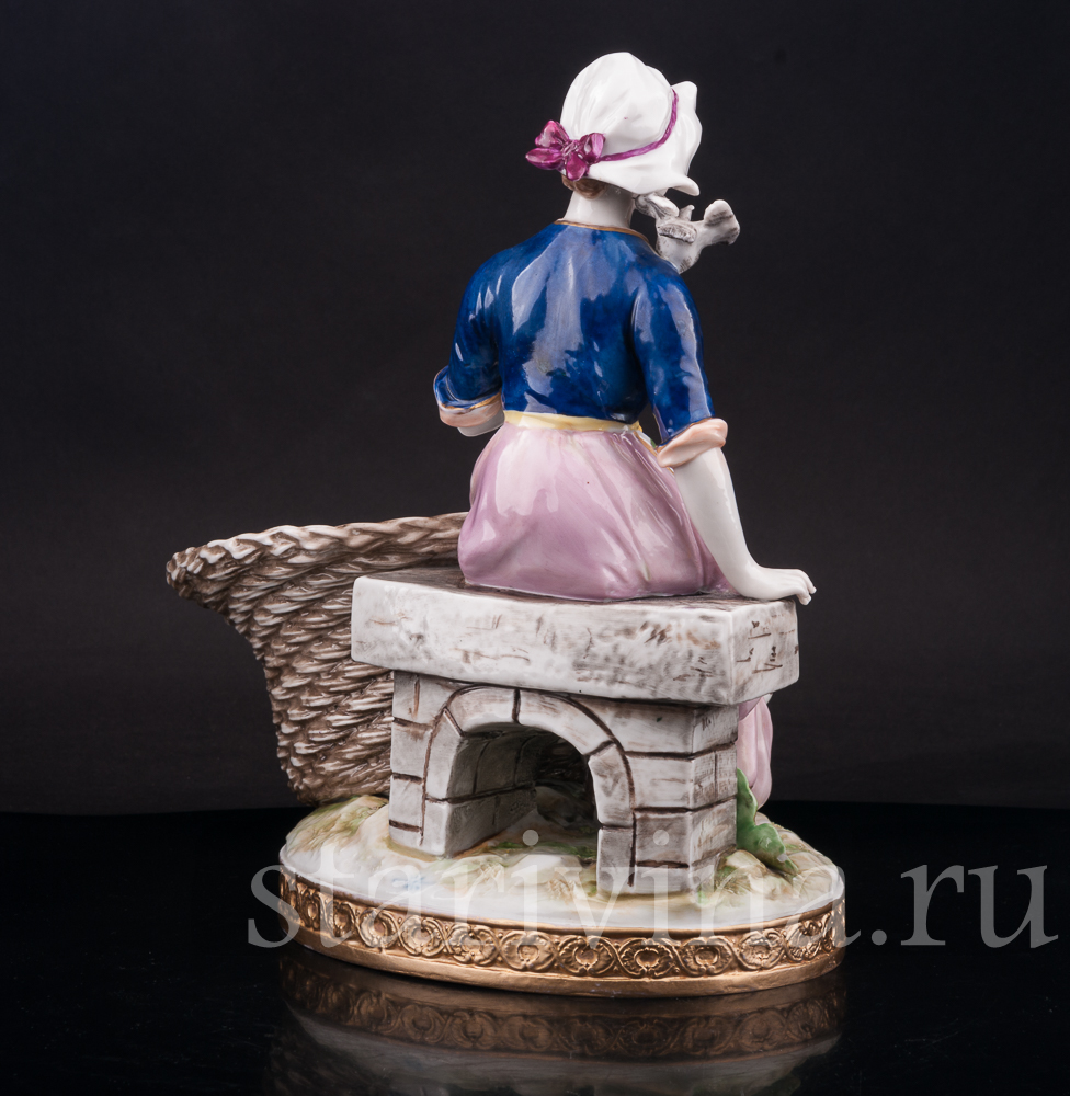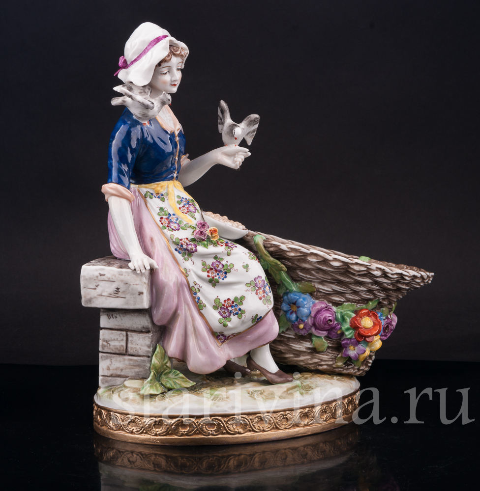 Старинная фарфоровая композиция с девушкой, кормящей птиц, создана в крупнейшем фарфоровом центре Германии - Volkstedt.