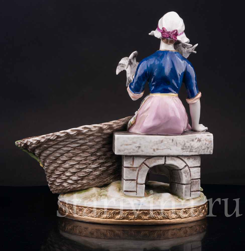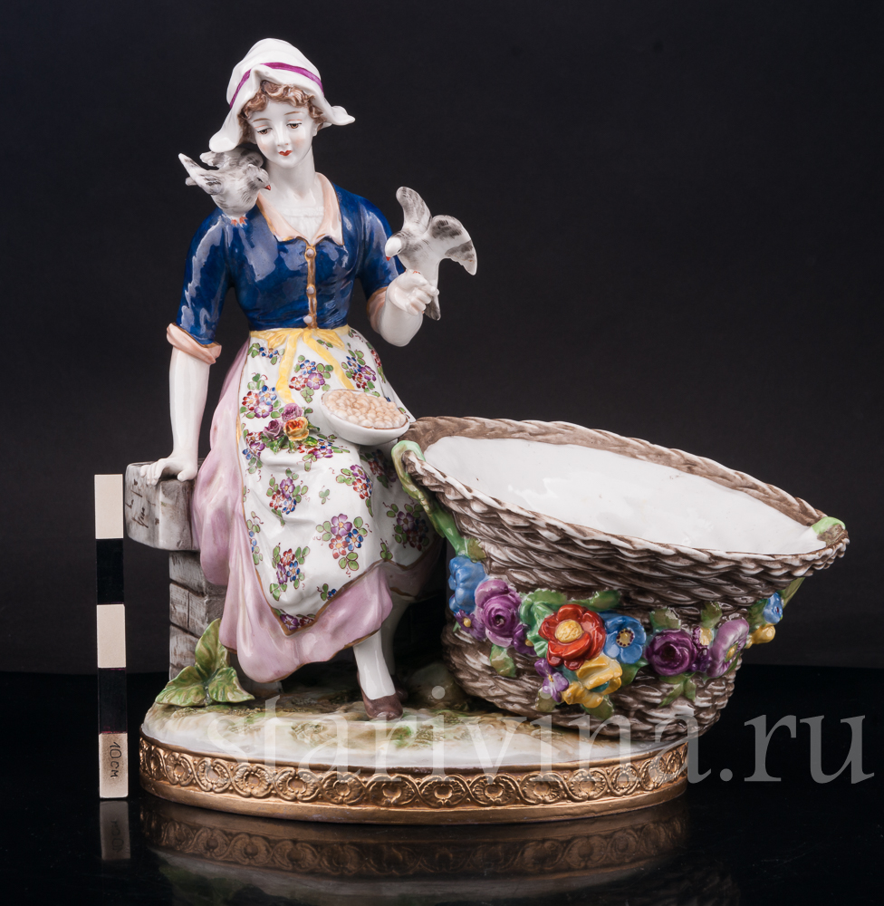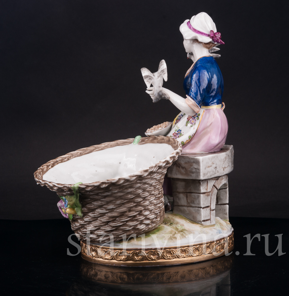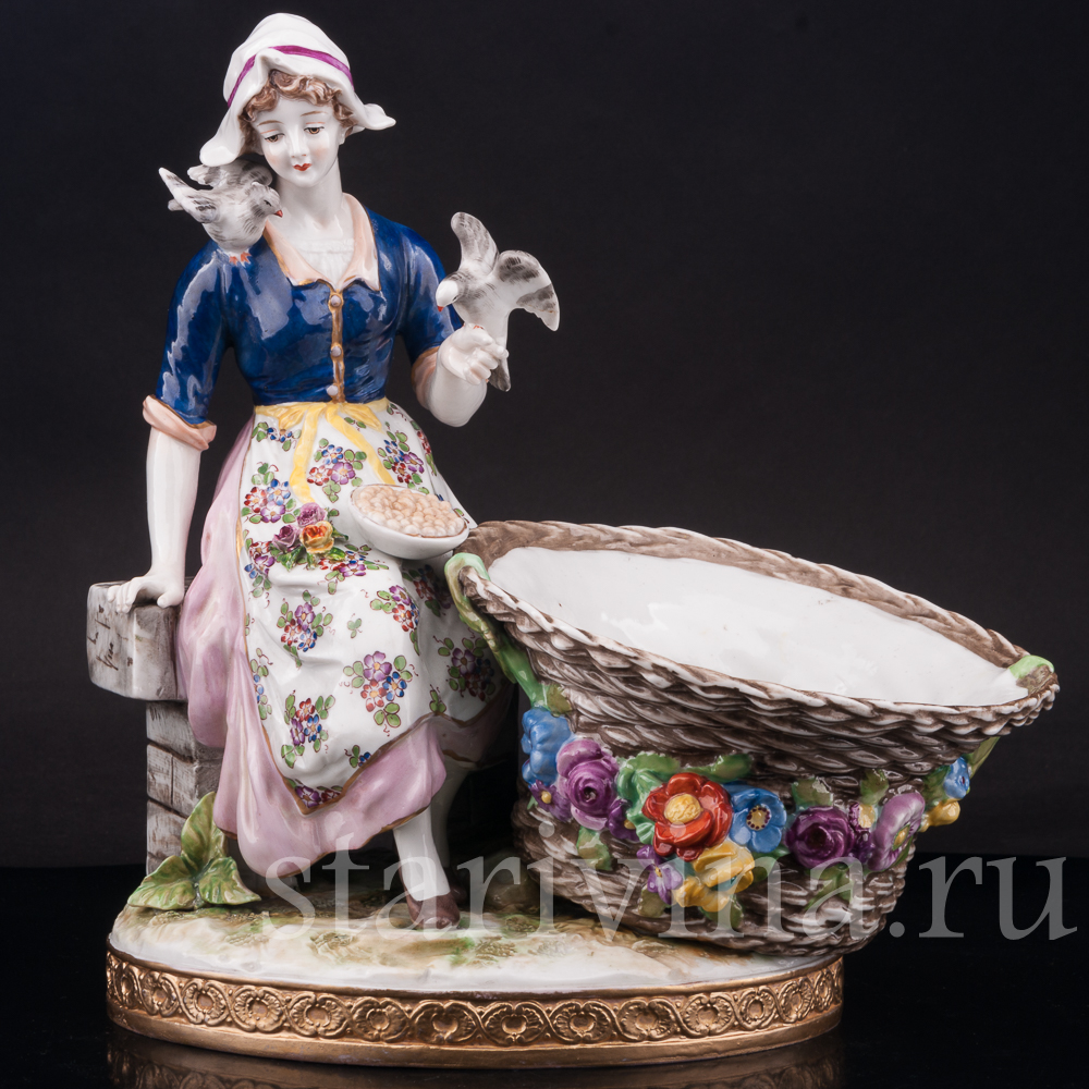 Старинная фарфоровая композиция с девушкой, кормящей птиц, создана в крупнейшем фарфоровом центре Германии - Volkstedt.