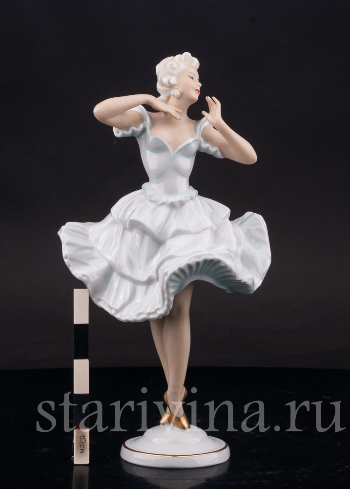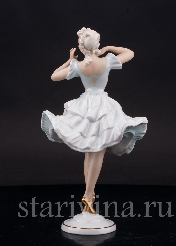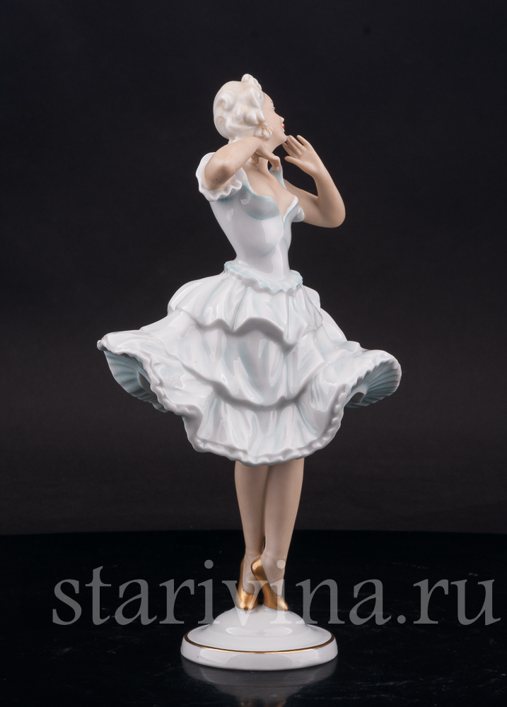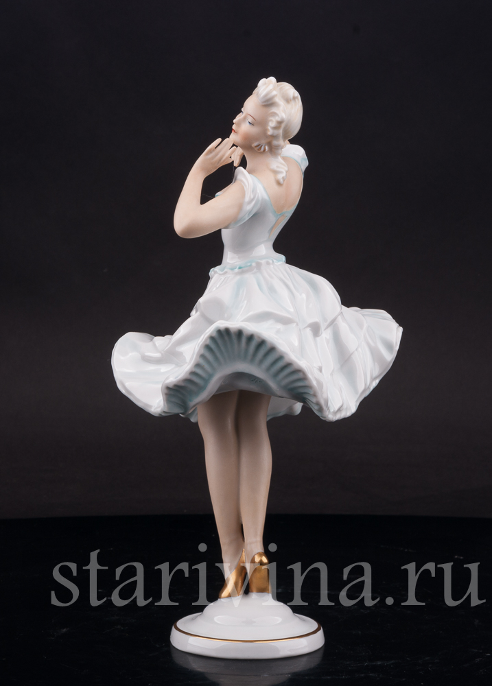 Эта изящная фарфоровая фигура танцовщицы родом с прославленной немецкой мануфактуры Unterweissbach, основанной в 1880 году в одноименном городе. Фабрика славится своей уникальной серией женских образов, отличающихся узнаваемым стилем и новаторским сочетанием надглазурной и подглазурной росписи.мДевушка запечатлена в пике экспрессивного танца. Ее руки подняты к лицу в красивом жесте а пышная юбка взлетает, открывая стройные ноги в золотых туфельках. Блестящая глазурь бело-голубого платья в контрасте с тонкой надглазурной росписью тела создает иллюзию живой кожи – эффект, полюбившийся ценителям фабрики.