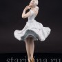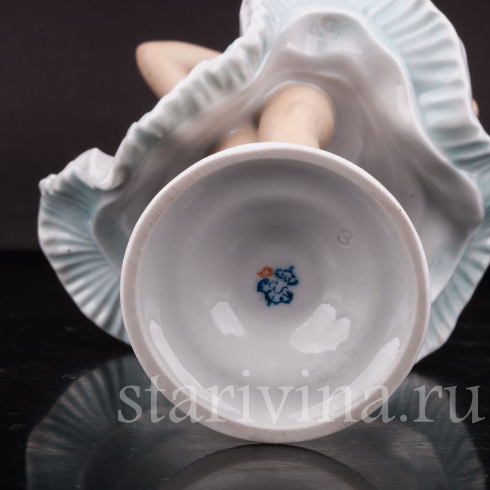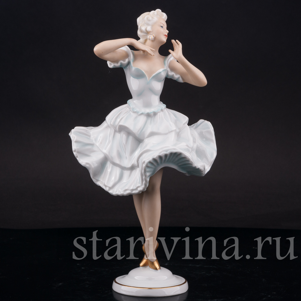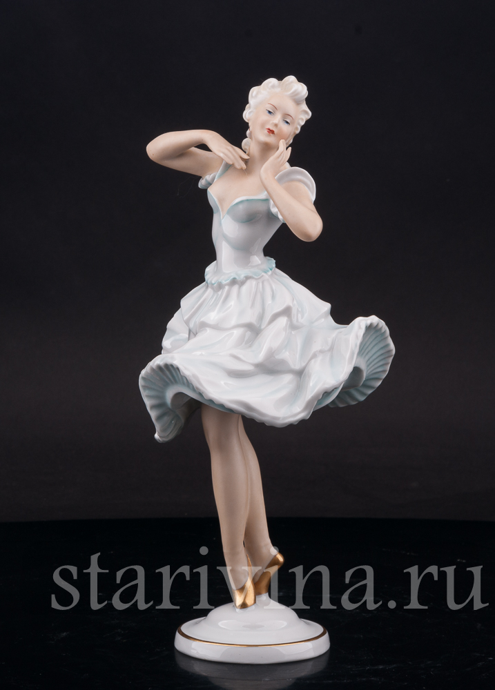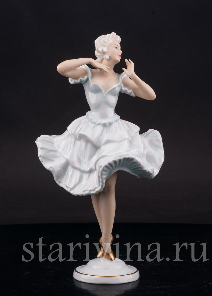 Эта изящная фарфоровая фигура танцовщицы родом с прославленной немецкой мануфактуры Unterweissbach, основанной в 1880 году в одноименном городе. Фабрика славится своей уникальной серией женских образов, отличающихся узнаваемым стилем и новаторским сочетанием надглазурной и подглазурной росписи.мДевушка запечатлена в пике экспрессивного танца. Ее руки подняты к лицу в красивом жесте а пышная юбка взлетает, открывая стройные ноги в золотых туфельках. Блестящая глазурь бело-голубого платья в контрасте с тонкой надглазурной росписью тела создает иллюзию живой кожи – эффект, полюбившийся ценителям фабрики.