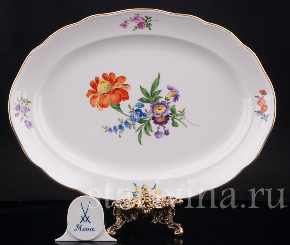 Белое овальное блюдо с плоскими бортами украшено традиционной цветочной росписью, используемой на фабрике Meissen несколько столетий. В центре блюда расположен букет с ярким оранжевым георгином, небольшие букеты украшают четыре стороны по бортам. Волнистый край блюда очерчен позолотой, подчеркивающей элегантность узора, гармонично сочетающего яркие краски росписи с белыми пустыми пространствами.