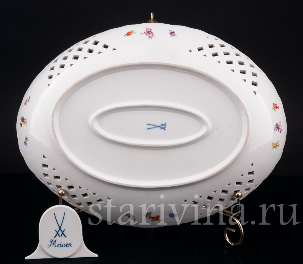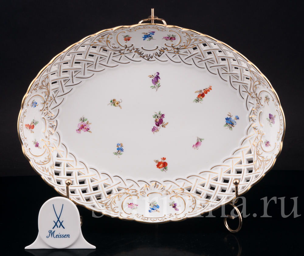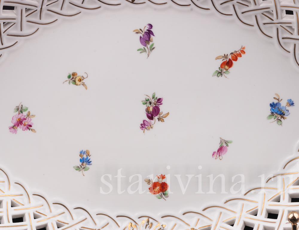 Блюдо овальной формы украшено по борту прорезным узором, а в центре цветочными букетами с одним из традиционных и узнаваемых мотивов Meissen. Тонкая позолота подчеркивает прорези и орнаментальные резервы с цветами по краю тарелки. Разнообразные небольшие цветы на белом фоне смотрятся утонченно и благородно.