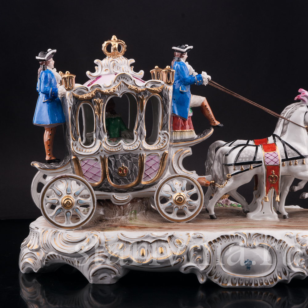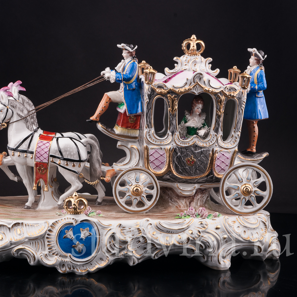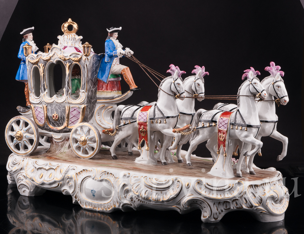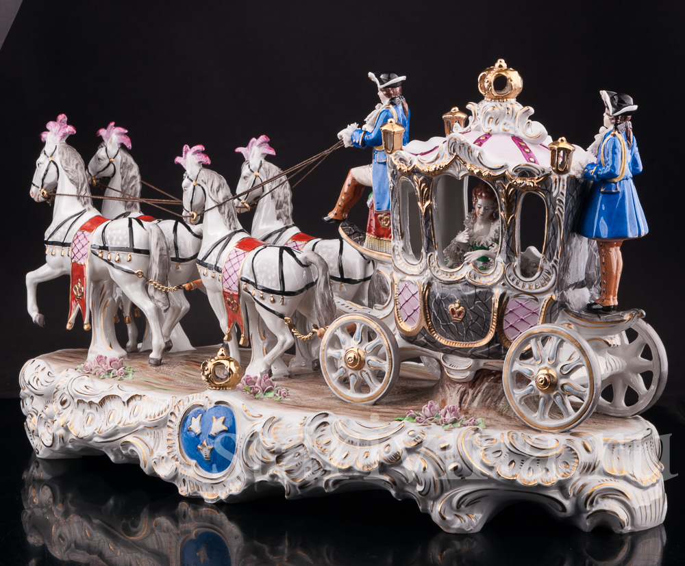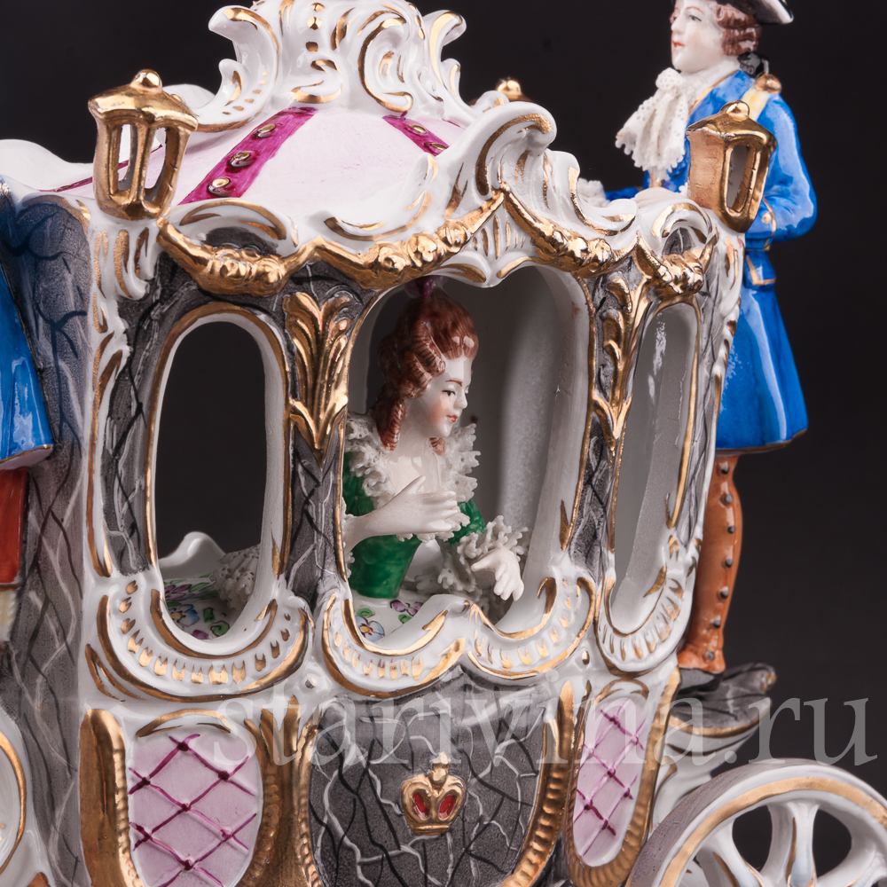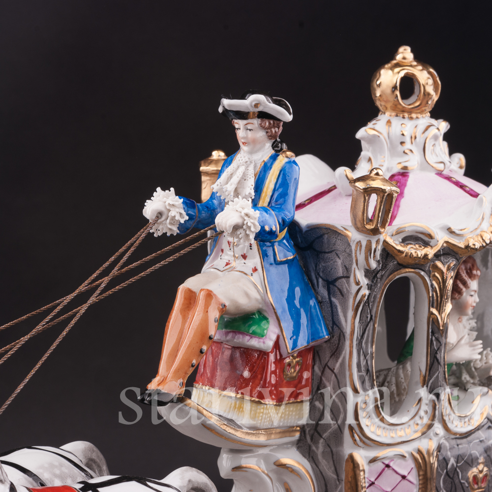 Данная карета выполнена на тюрингской мануфактуре в Зицендрофе в середине 20 века. Эта мануфактура известна всем собирателям и коллекционерам фарфора прежде всего своими статуэтками в стиле рококо и кружевными композициями. Используется кружево и в декоре этой кареты, но и помимо кружева есть чем восхититься! Фигуры лошадей, элементы упряжи, декор кареты, наконец фигуры кучера, лакея и самой пассажирки — все выполнено с величайшим мастерством и вниманием к деталям. Богатая роспись и множество декоративных элементов завершают композицию, подчеркивая её живописность и богатство.