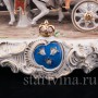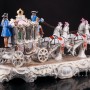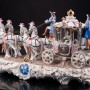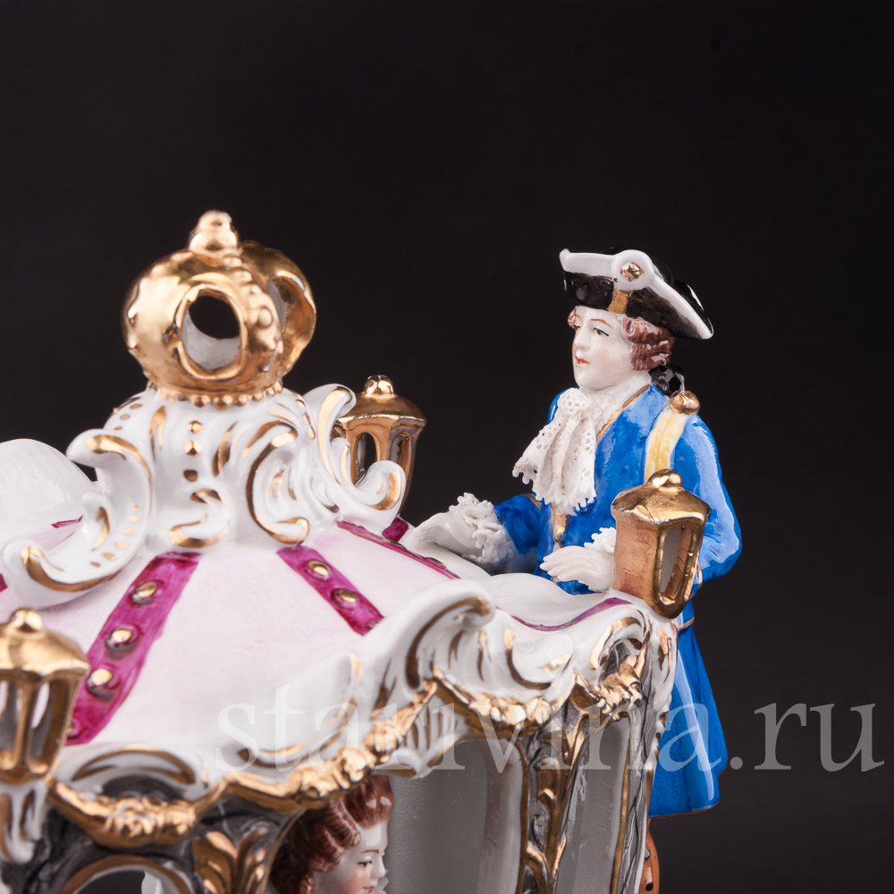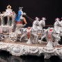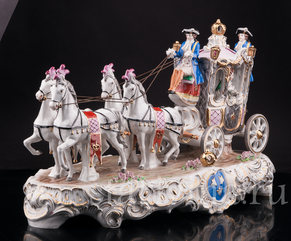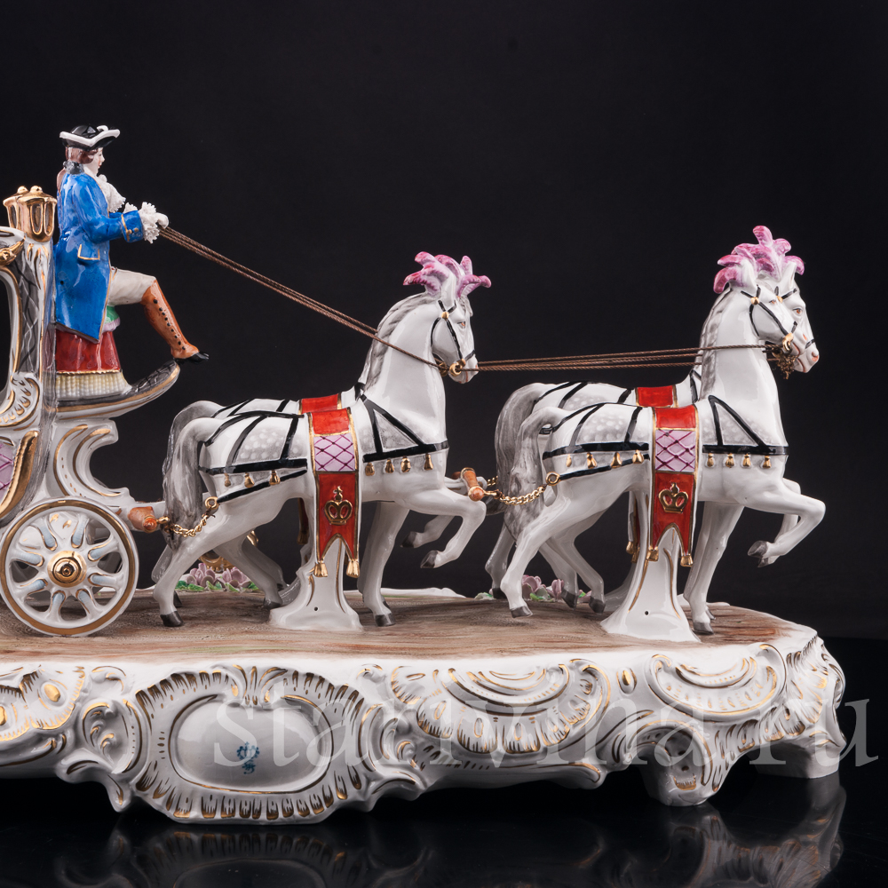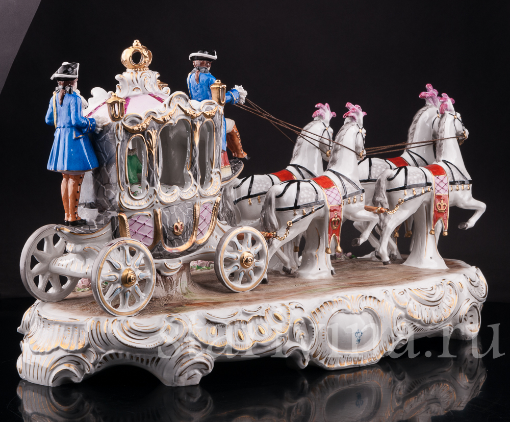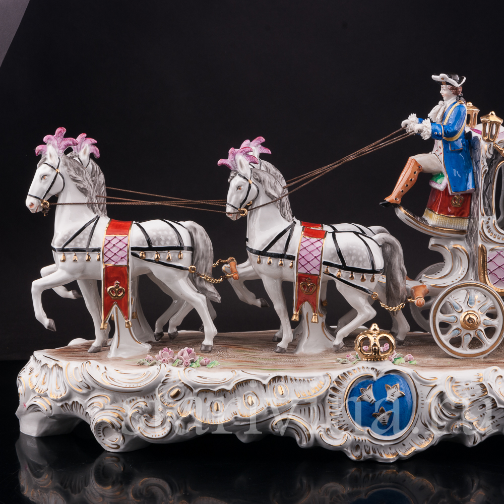 Данная карета выполнена на тюрингской мануфактуре в Зицендрофе в середине 20 века. Эта мануфактура известна всем собирателям и коллекционерам фарфора прежде всего своими статуэтками в стиле рококо и кружевными композициями. Используется кружево и в декоре этой кареты, но и помимо кружева есть чем восхититься! Фигуры лошадей, элементы упряжи, декор кареты, наконец фигуры кучера, лакея и самой пассажирки — все выполнено с величайшим мастерством и вниманием к деталям. Богатая роспись и множество декоративных элементов завершают композицию, подчеркивая её живописность и богатство.