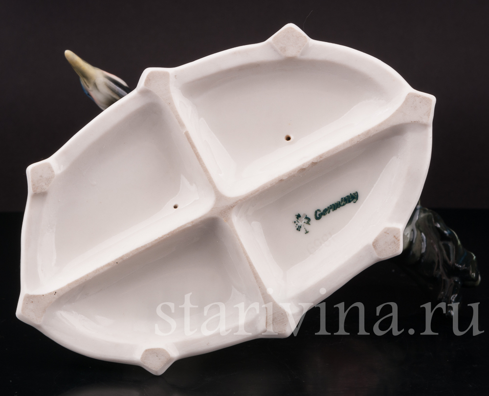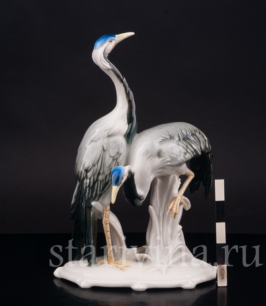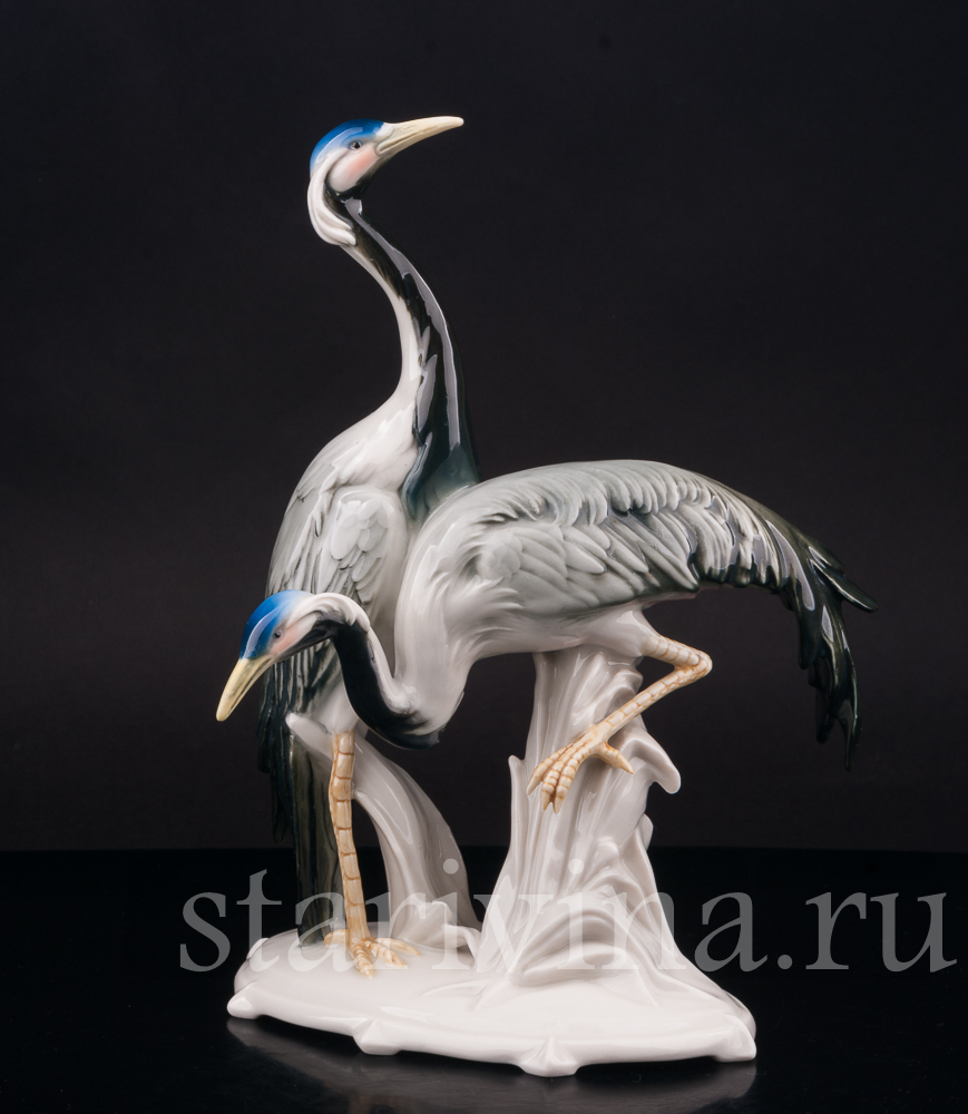 Старинная фарфоровая композиция с двумя журавлями была создана на фабрике Карла Энса в первой половине прошлого века. Тюрингская мануфактура, известная своими статуэтками птиц, славится подглазурной росписью и узнаваемым фирменным стилем.