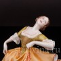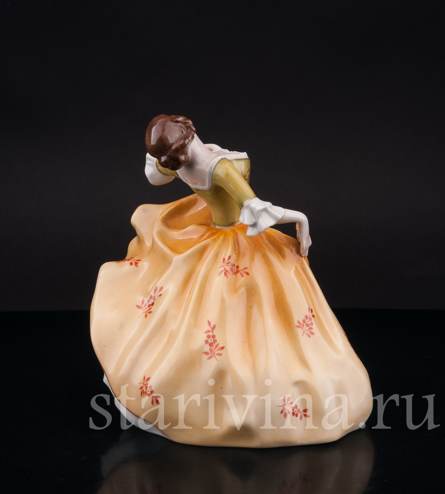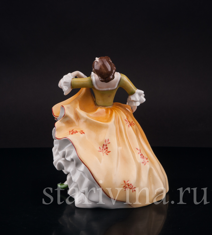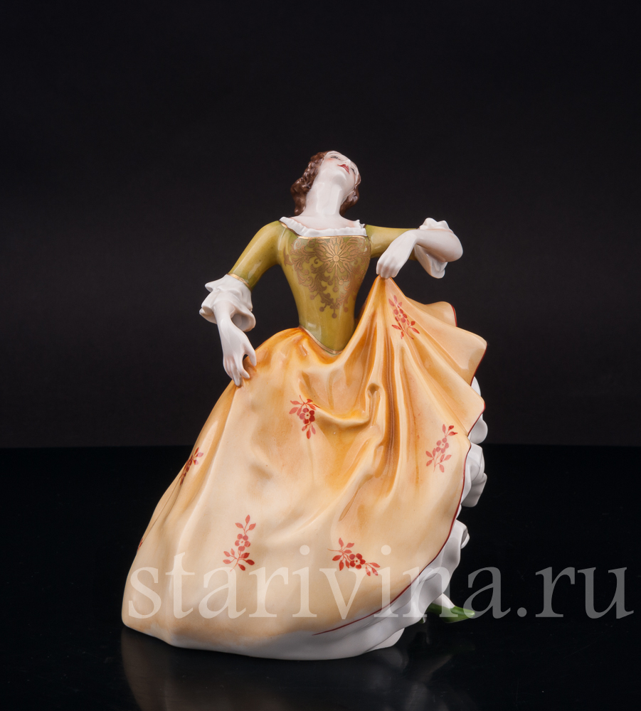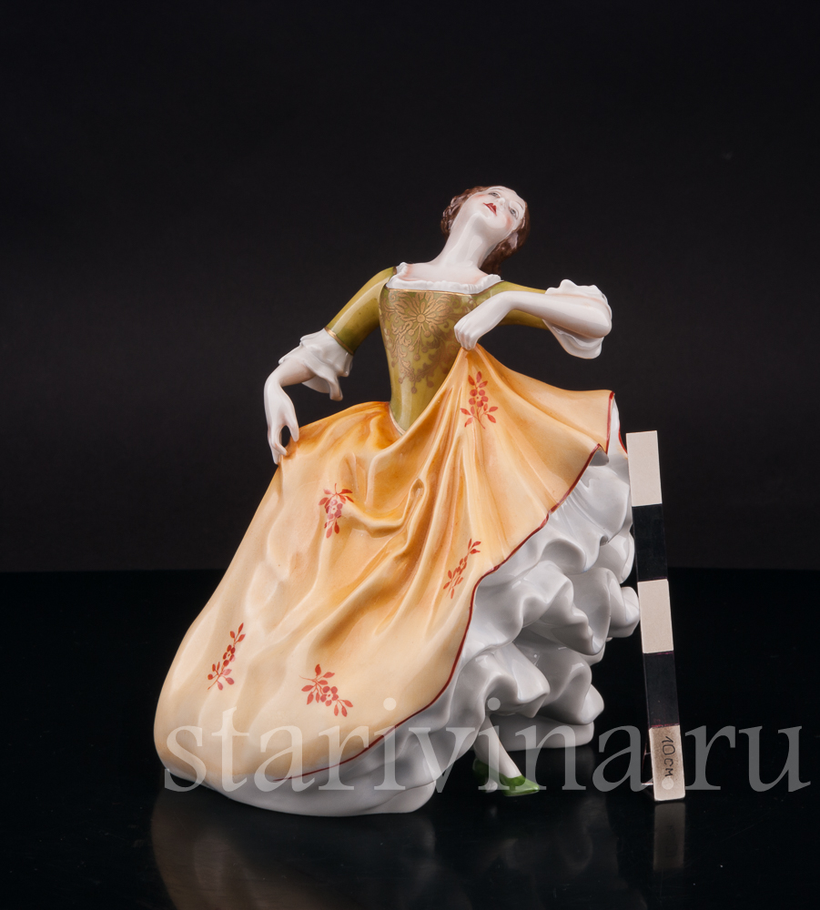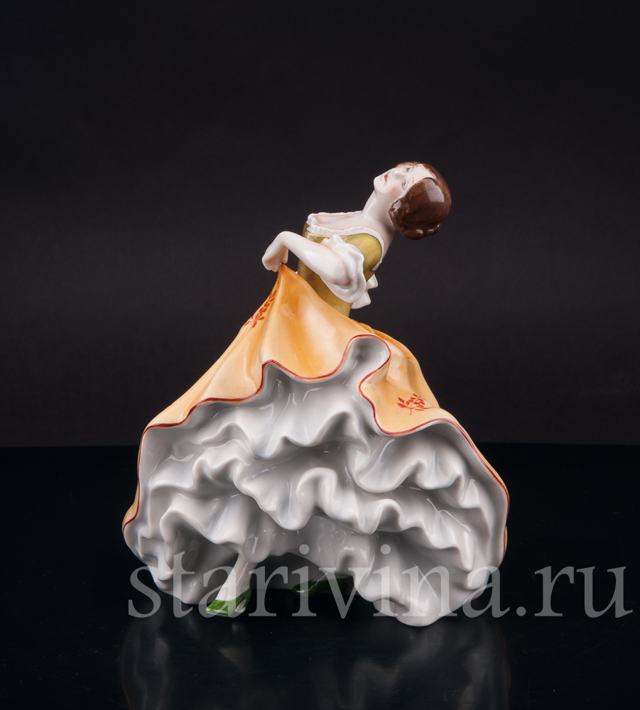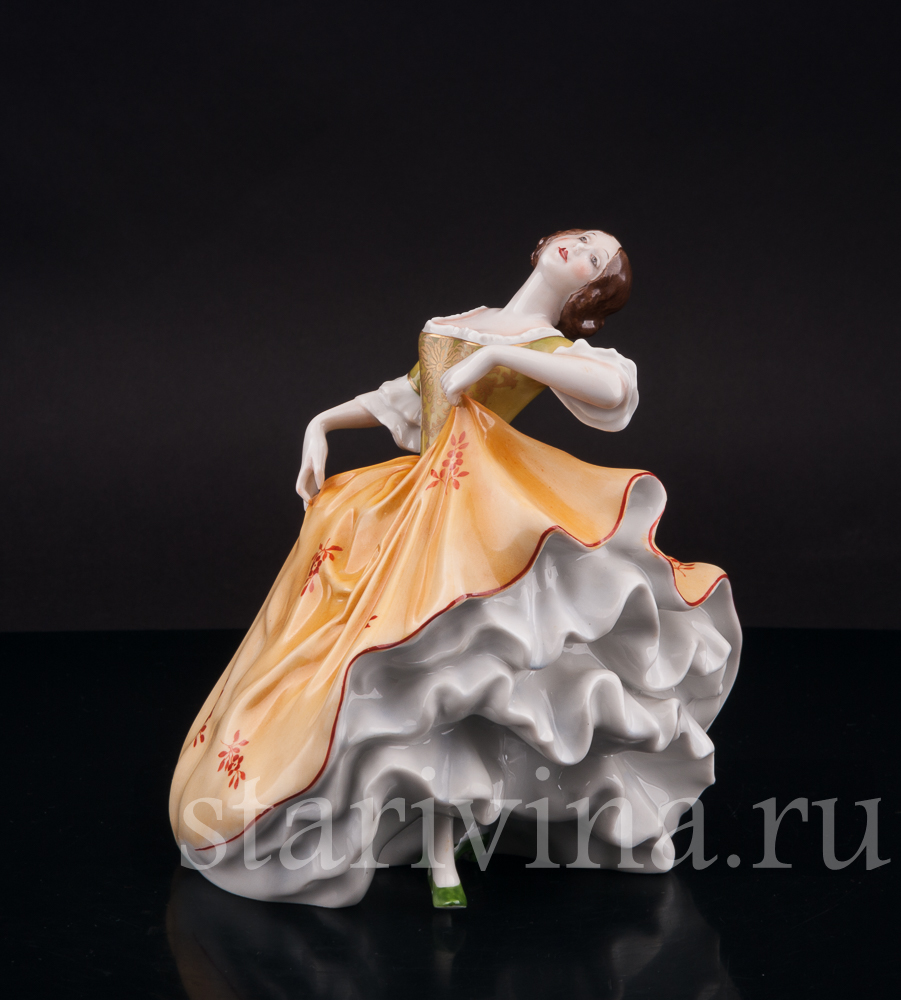 Фигура девушки, полная жизни и экспрессии, замерла в самом разгаре танца. Страстный изгиб тела, легкий наклон назад, приподнятый подол пышного платья – всё говорит о предвкушении следующего грациозного движения. Невесомый фарфор мастерски передает гибкость ее стана и одновременно ощутимую тяжесть многослойных юбок, создавая завораживающий эффект плавного танца. Лицо, обрамленное локонами волос, обладает особой, чуть отрешенной красотой, словно погруженное в мечты. Нежность черт подчеркнута полупрозрачной росписью платья, напоминающей тончайший шелк. Яркий контраст зеленого лифа и желтой юбки, украшенных изысканным позолоченным узором, придает одеянию поистине праздничный вид.