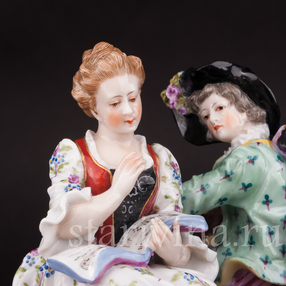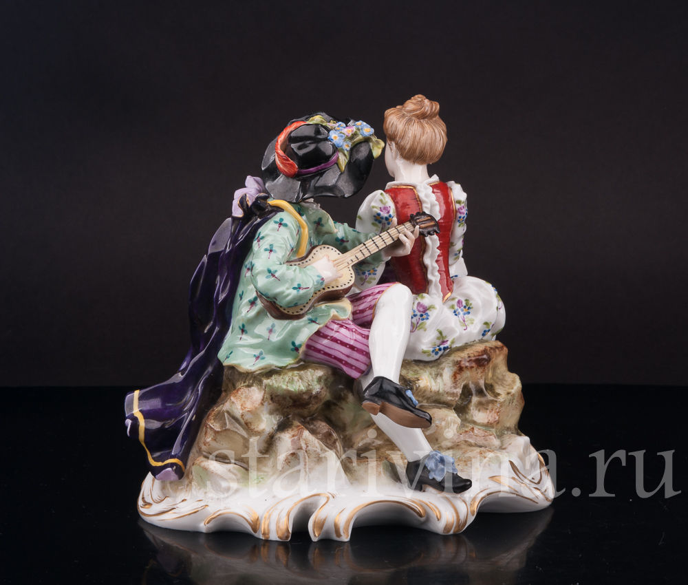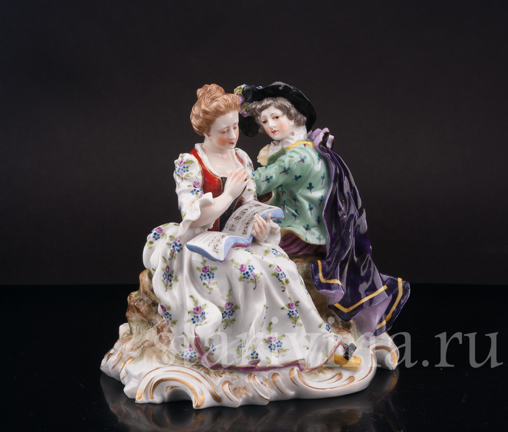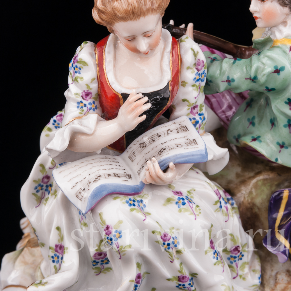 Старинная пара запечатлена в трогательный момент музицирования: он искусно играет на гитаре, а она, с нотами в руках, словно вторит ему нежным пением. Фигура выполнена с исключительным мастерством: яркие и нежные оттенки красок контрастируют, создавая живописный образ, а тонкие узоры добавляют изысканности. Искусно проработанные складки одежд и внимание к каждой детали свидетельствуют о высочайшем уровне исполнения.