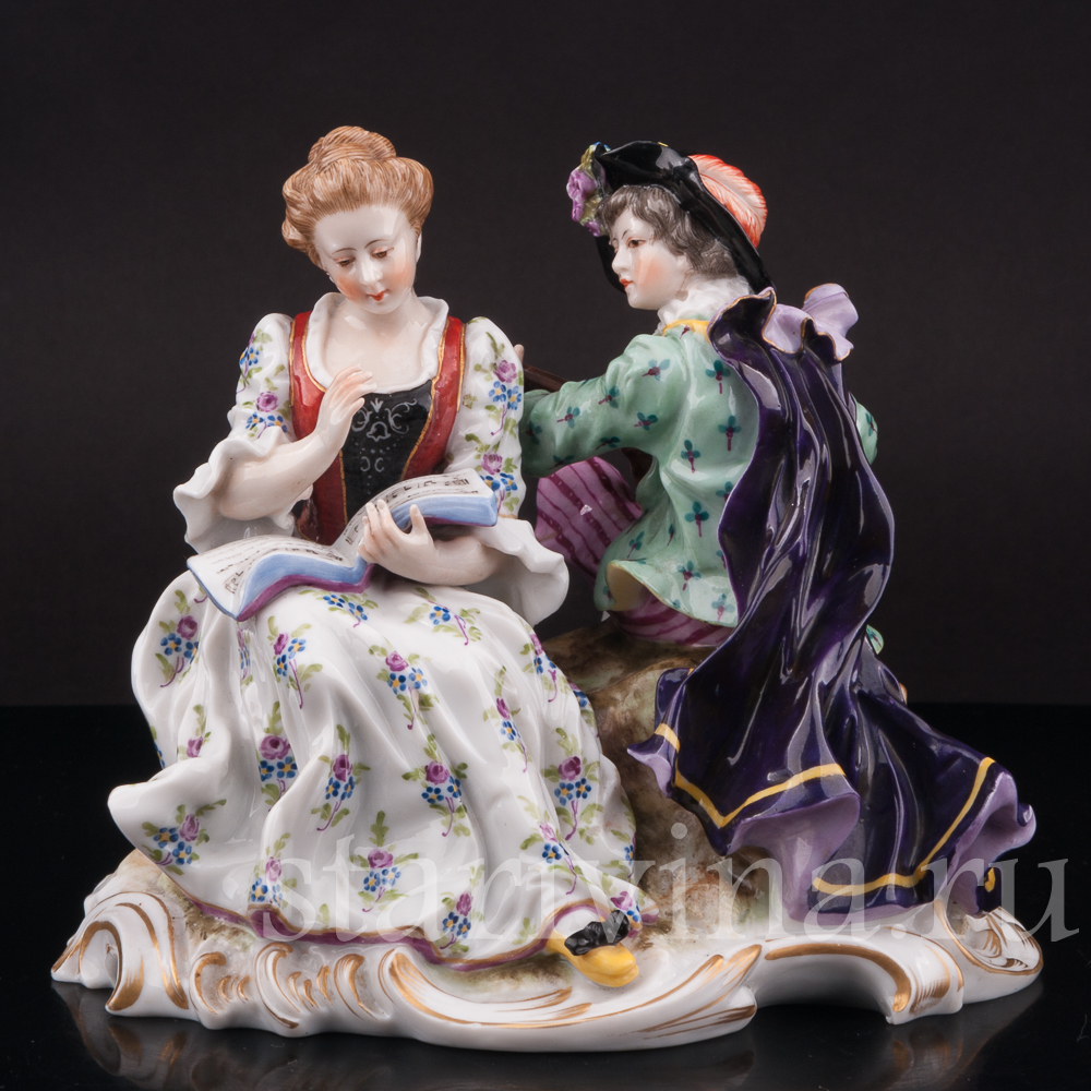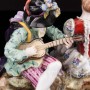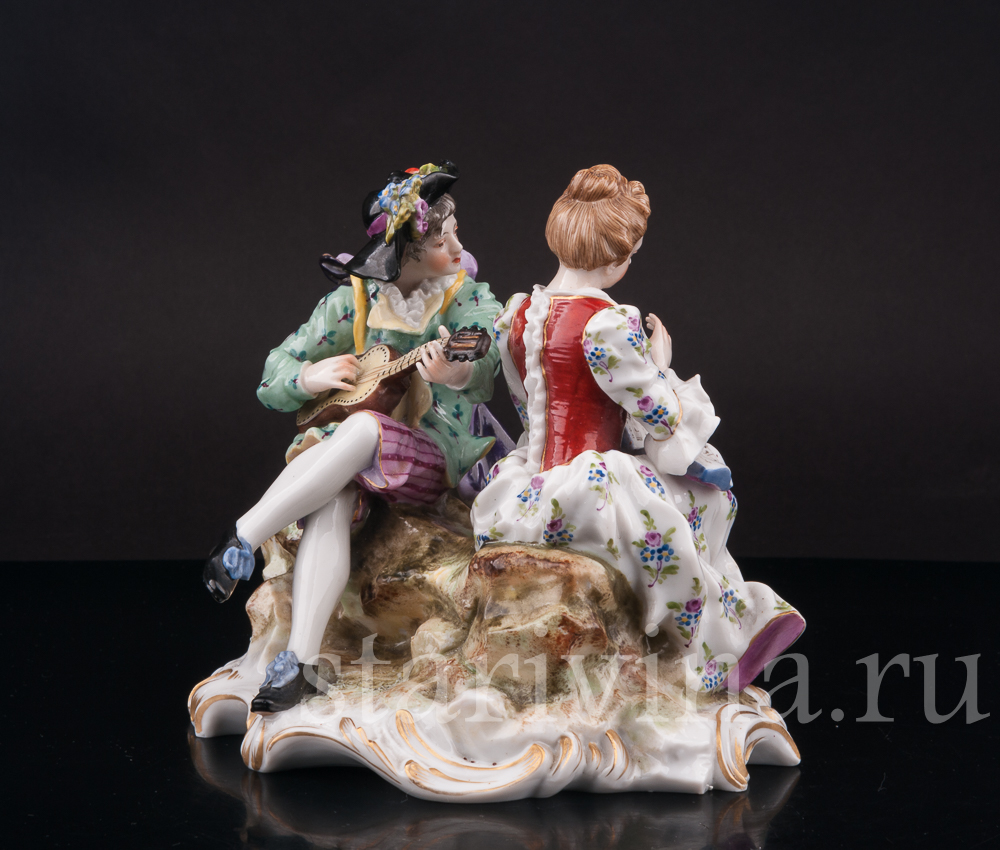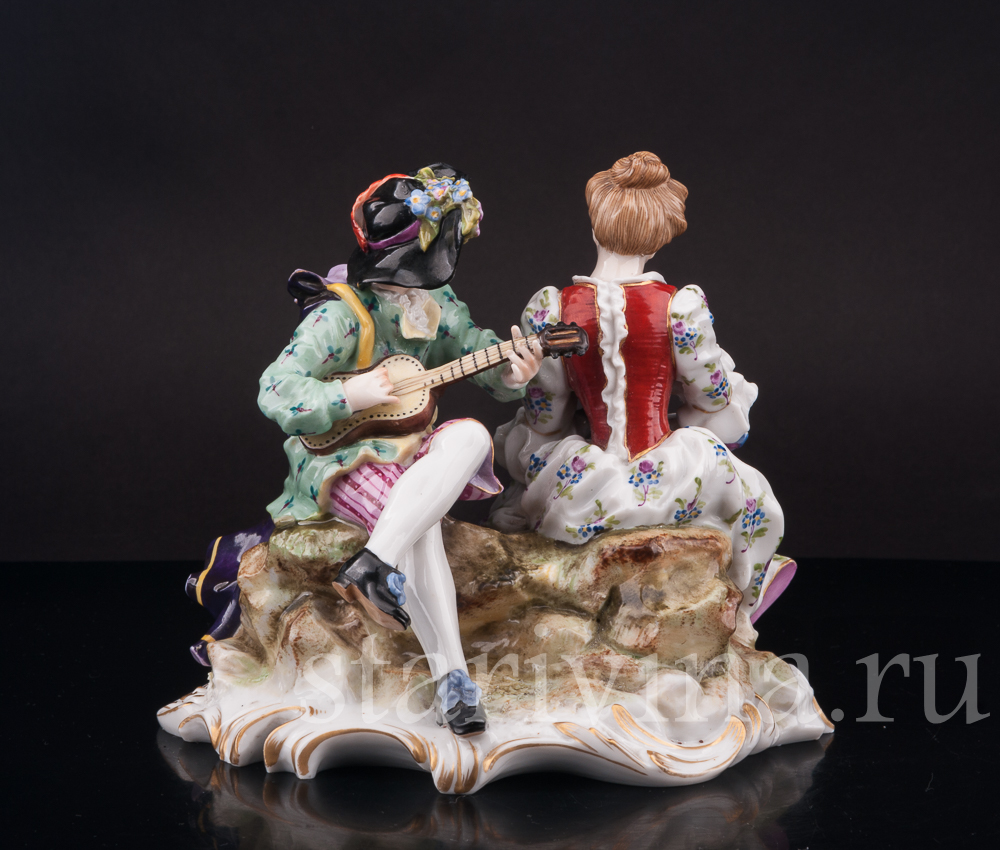 Старинная пара запечатлена в трогательный момент музицирования: он искусно играет на гитаре, а она, с нотами в руках, словно вторит ему нежным пением. Фигура выполнена с исключительным мастерством: яркие и нежные оттенки красок контрастируют, создавая живописный образ, а тонкие узоры добавляют изысканности. Искусно проработанные складки одежд и внимание к каждой детали свидетельствуют о высочайшем уровне исполнения.
