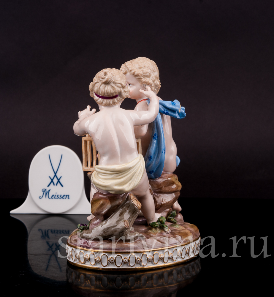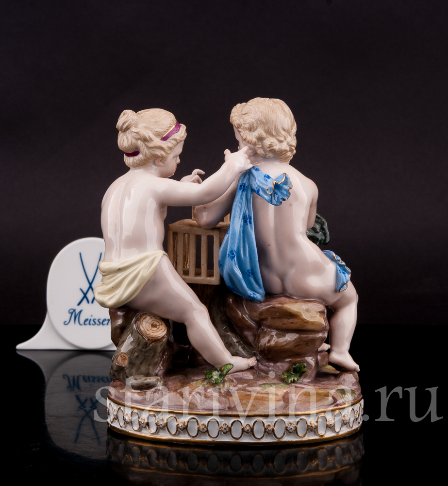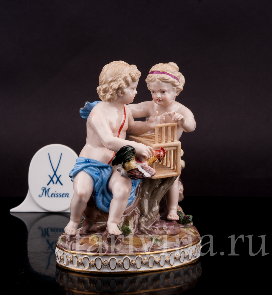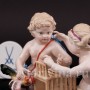 Перед нами — одно из жемчужин фабрики: изящная статуэтка путти с петушком. Образы маленьких, обнаженных или полуобнаженных детей, известных как путти, берут свое начало в ренессансном и классическом искусстве, черпая вдохновение в античных эротах и купидонах. Эта тема пользовалась особой популярностью среди создателей художественного фарфора.